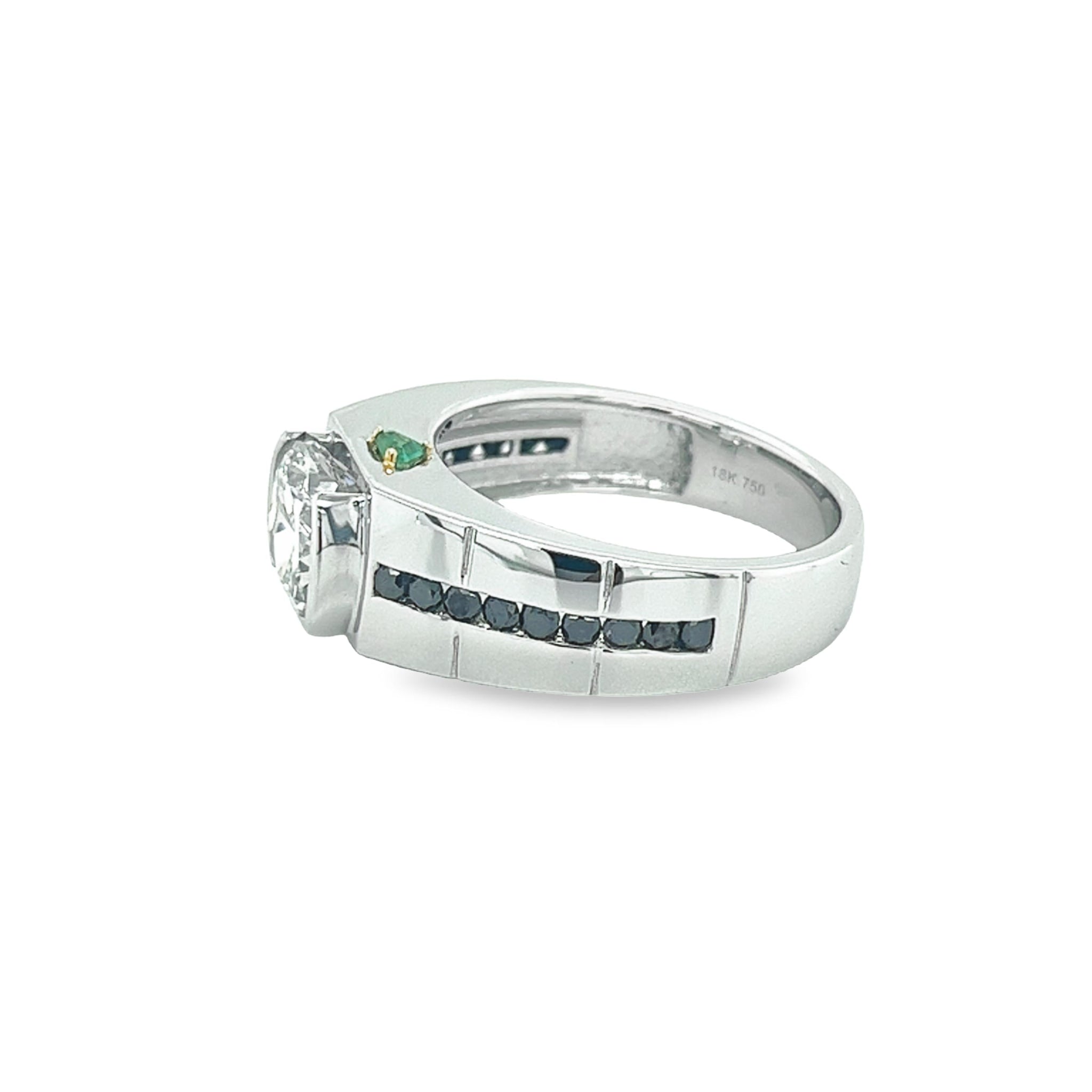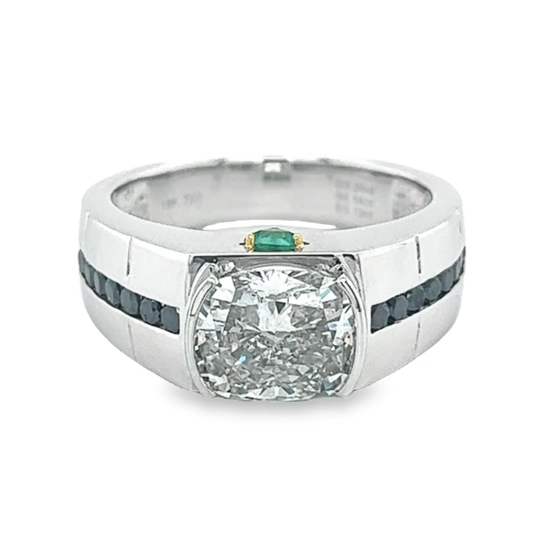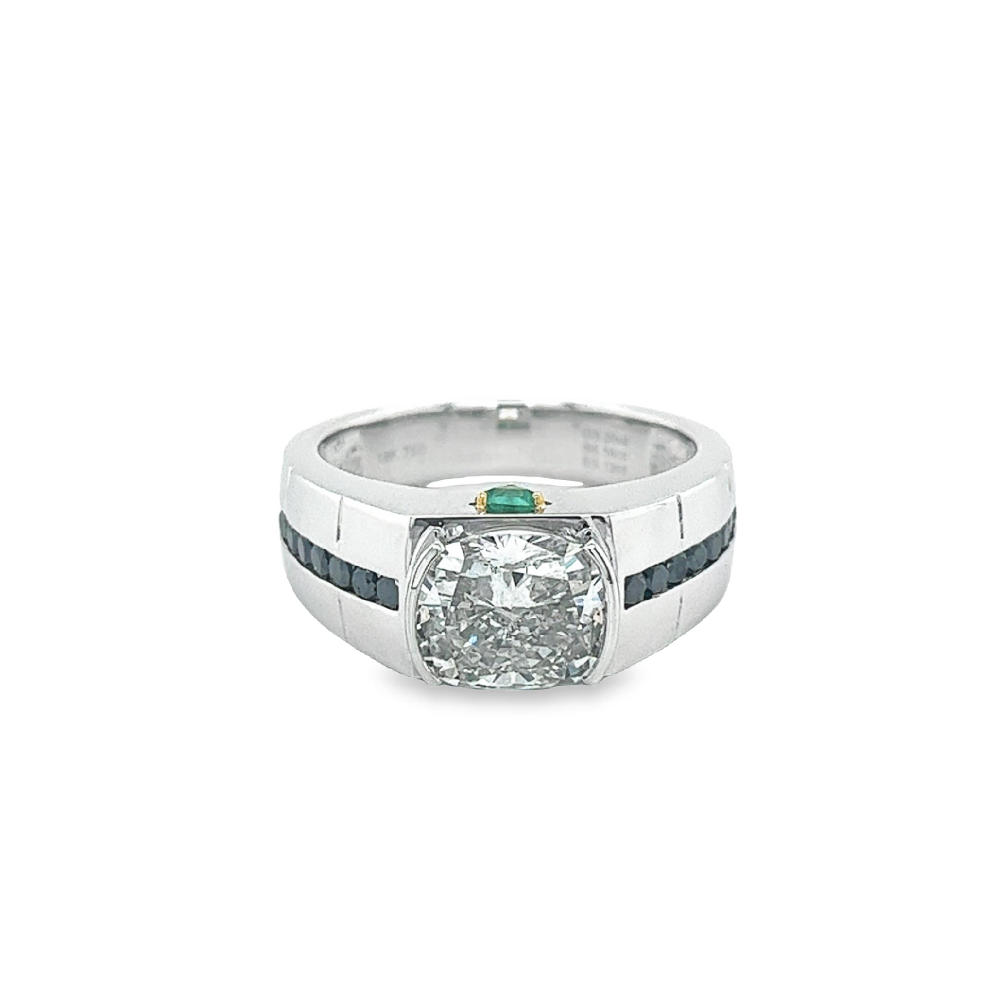 Introducing this aesthetic masterpiece of fine jewelry. Half Bezel set cushion cut center stone, channel set black diamonds, and prong set emeralds. Each and every stone is symmetrically set with the optimal brilliance and color contrast in mind.