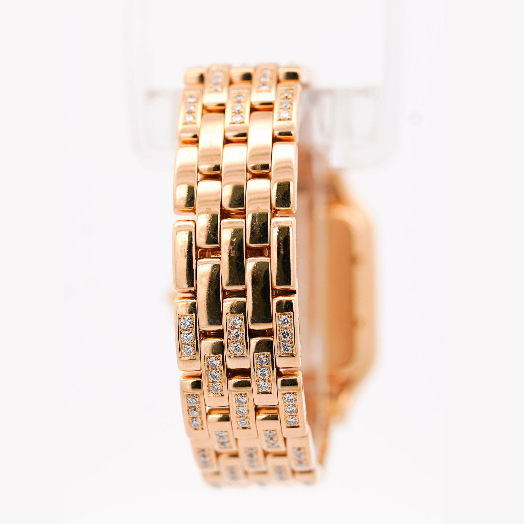 Cartier introduced the Panthere collection in 1983 as the successor to the Santos design, quickly becoming an icon of 1980s and 1990s luxury. The distinctive square case and integrated link bracelet create instantly recognizable silhouette synonymous with sophisticated elegance. Panthere watches represent Cartier's mastery of jewelry watchmaking, combining precious metals with gemstone embellishment. The name references Cartier's iconic panther motif symbolizing power, elegance, and independence. Diamond-set bezel models elevate the design into high jewelry territory while maintaining wearable proportions. Cartier Panthere watches remain highly collectible and have experienced strong resurgence in popularity among contemporary collectors. The all-gold construction with diamond bezel represents refined luxury suitable for formal occasions and everyday elegance.