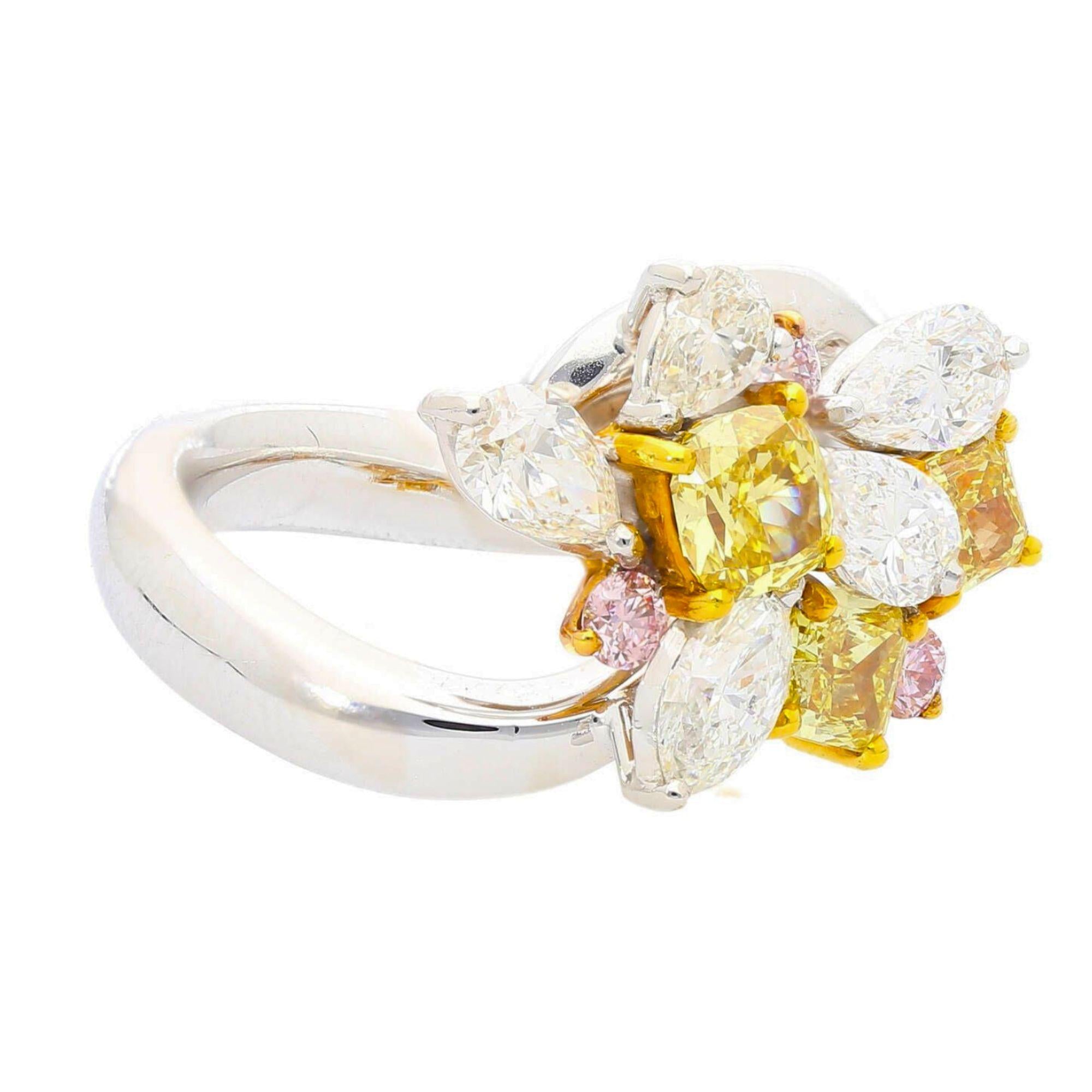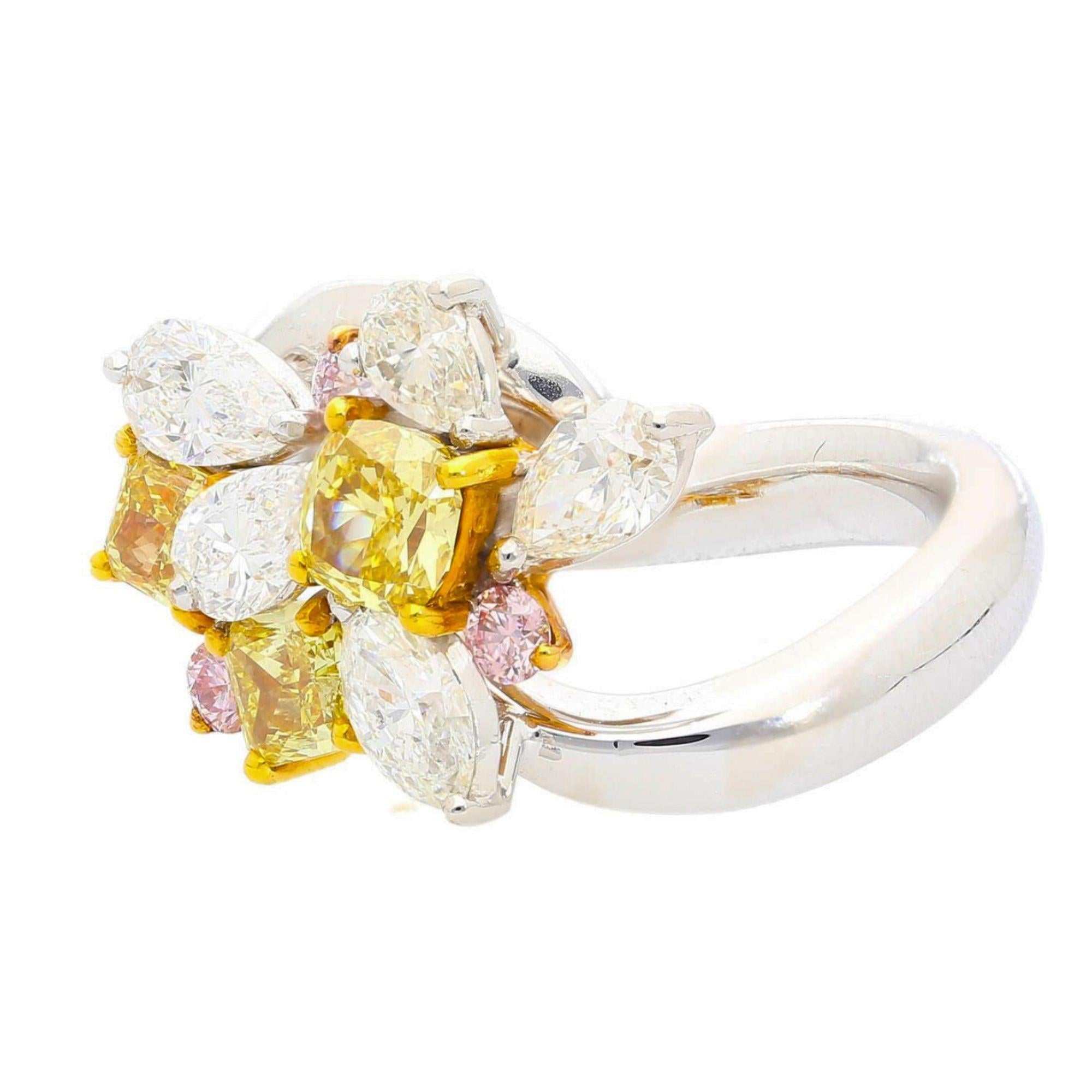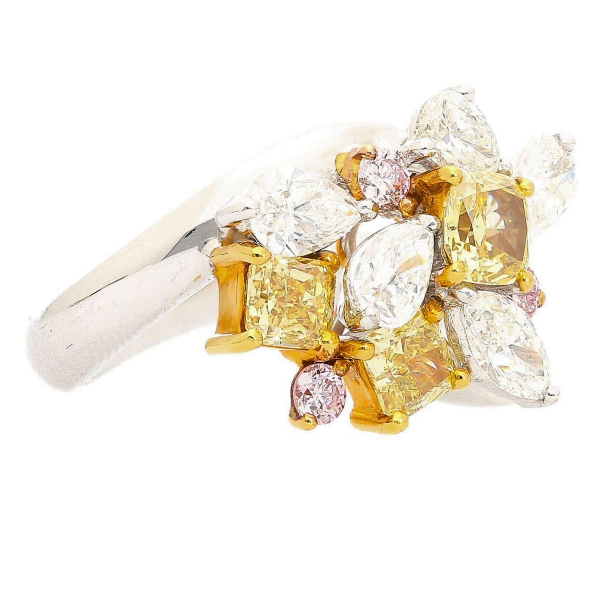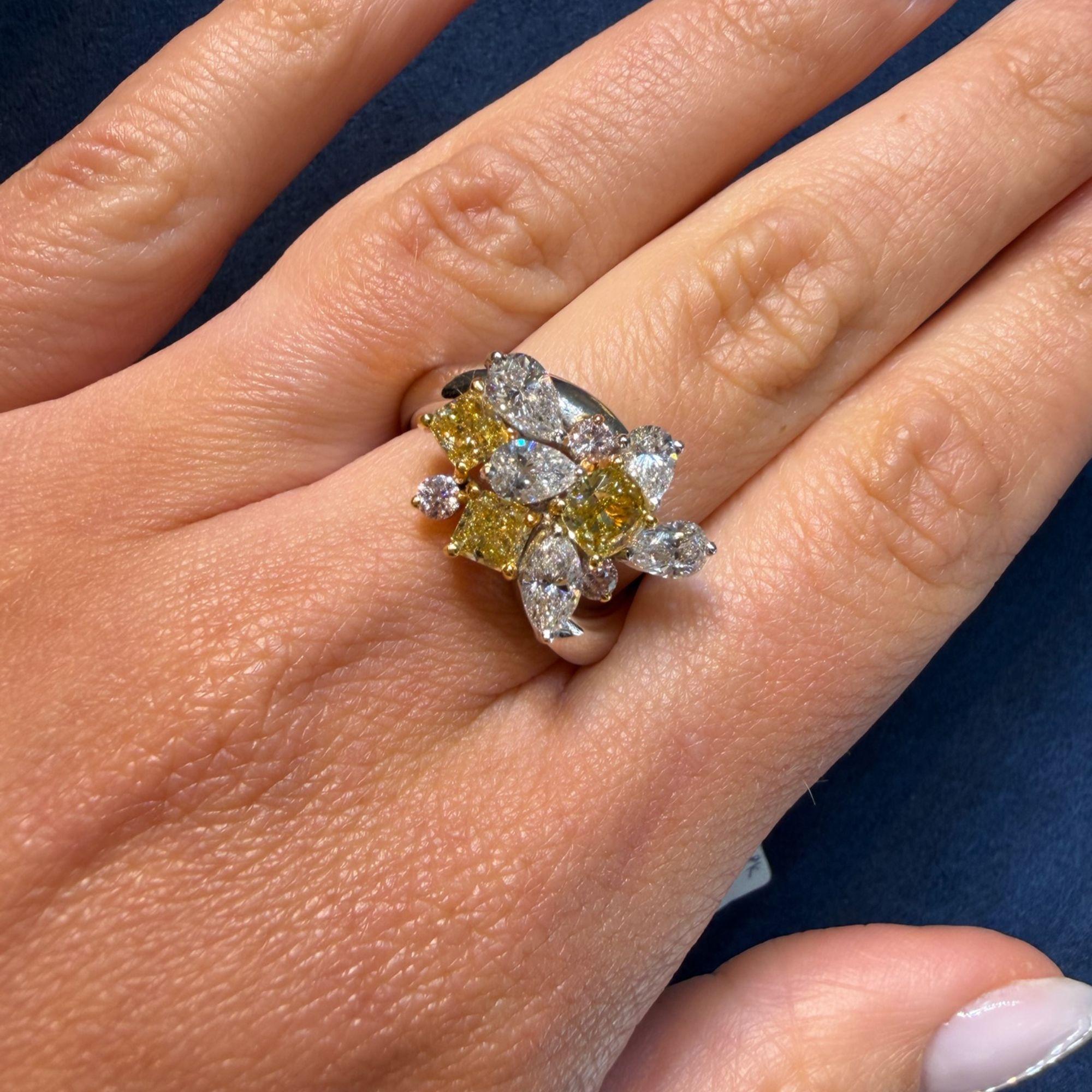 Natural and spectacular multi-shape diamond cluster cocktail ring set in platinum 950 and 18K yellow gold, featuring three fancy yellow cushion cut diamonds totaling 1.38 carats alongside white pear, marquise, and pink round diamonds for a total of approximately 3.07 carats.