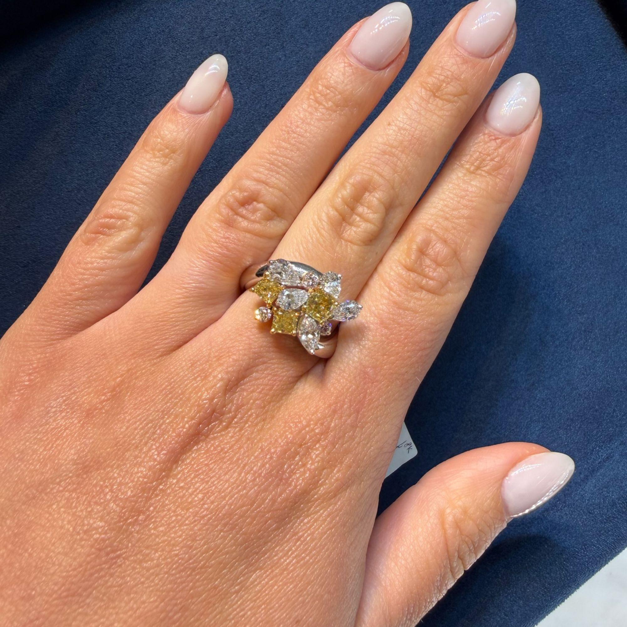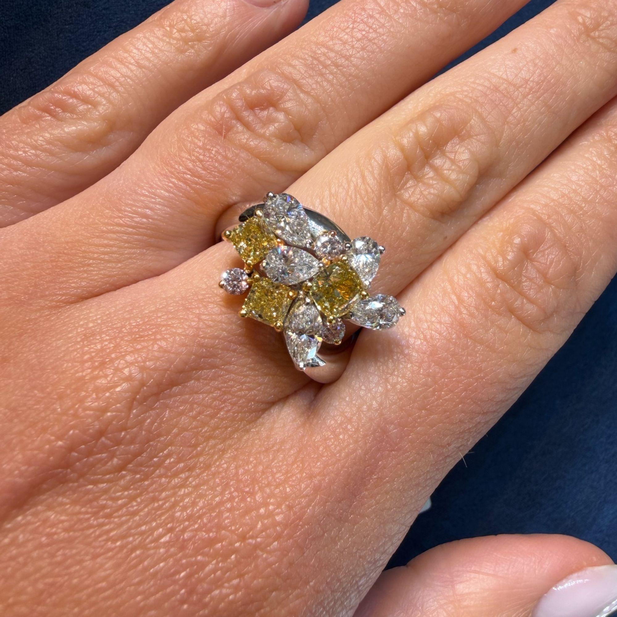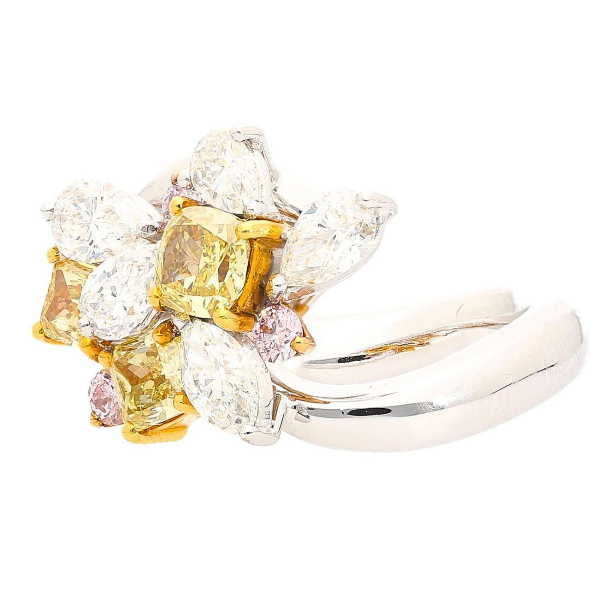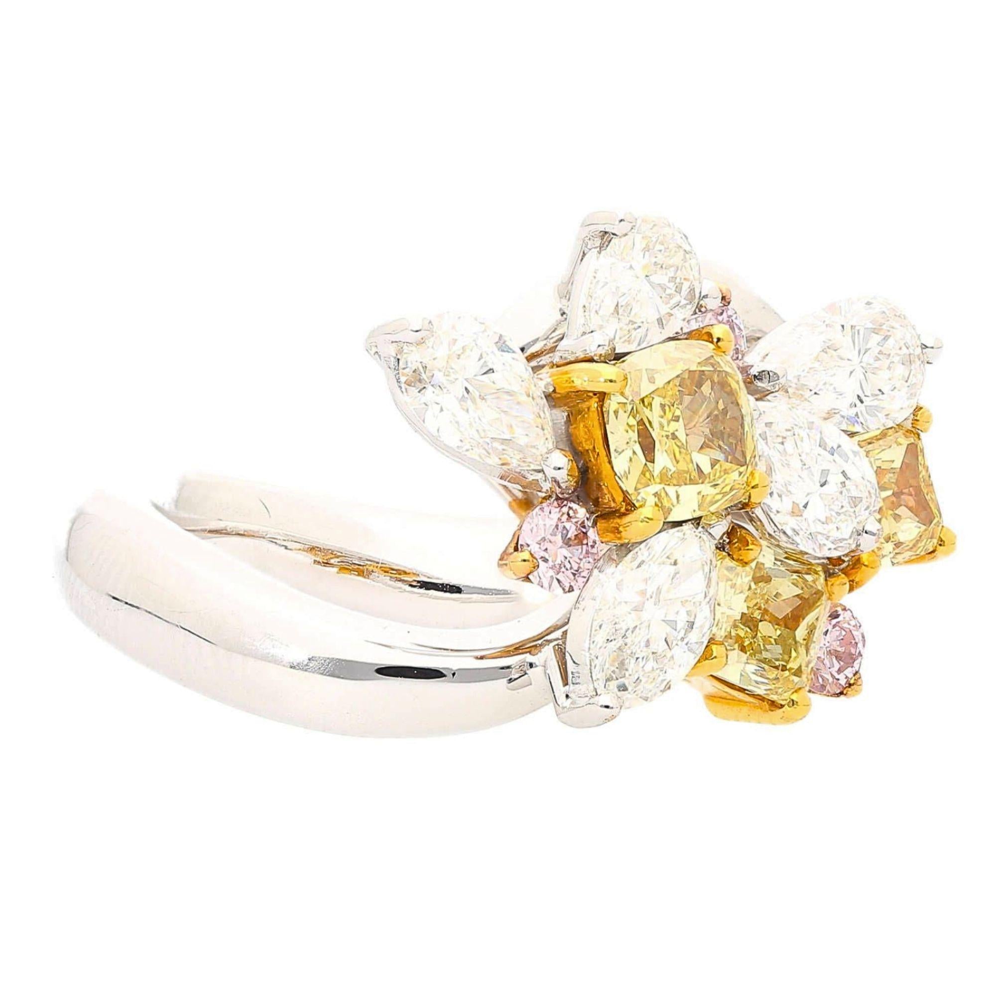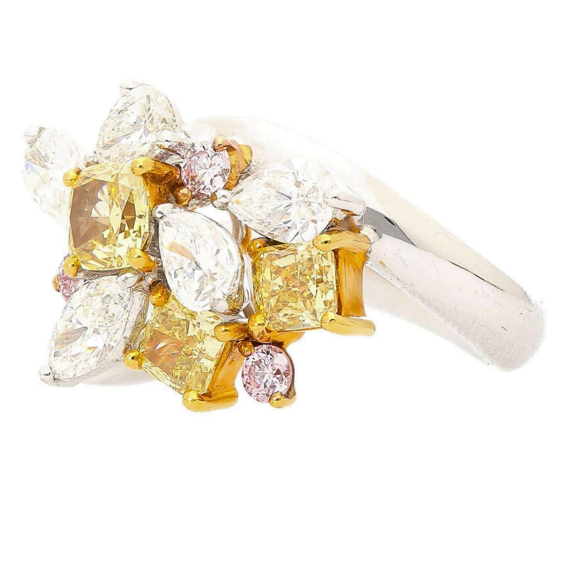 Natural and spectacular multi-shape diamond cluster cocktail ring set in platinum 950 and 18K yellow gold, featuring three fancy yellow cushion cut diamonds totaling 1.38 carats alongside white pear, marquise, and pink round diamonds for a total of approximately 3.07 carats.