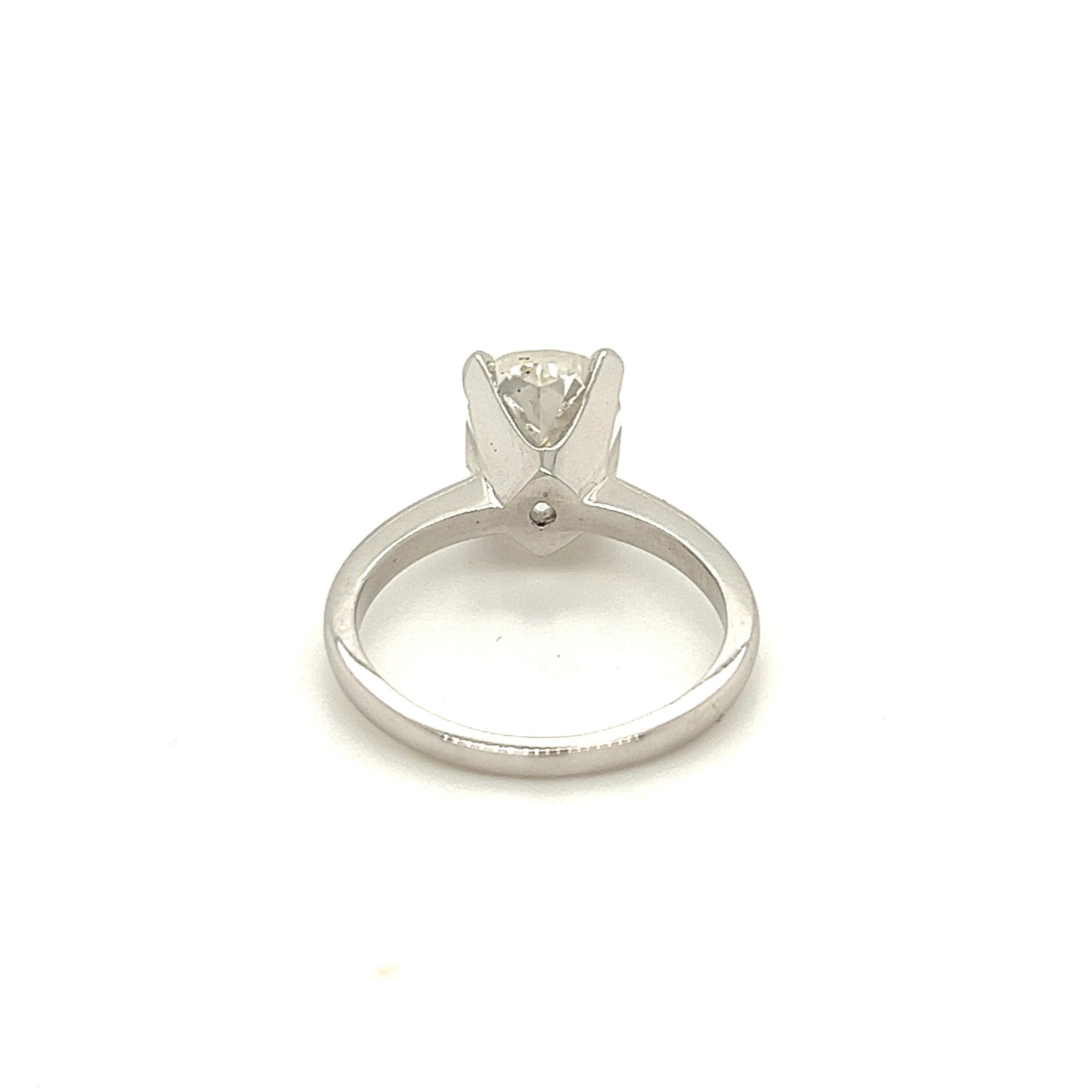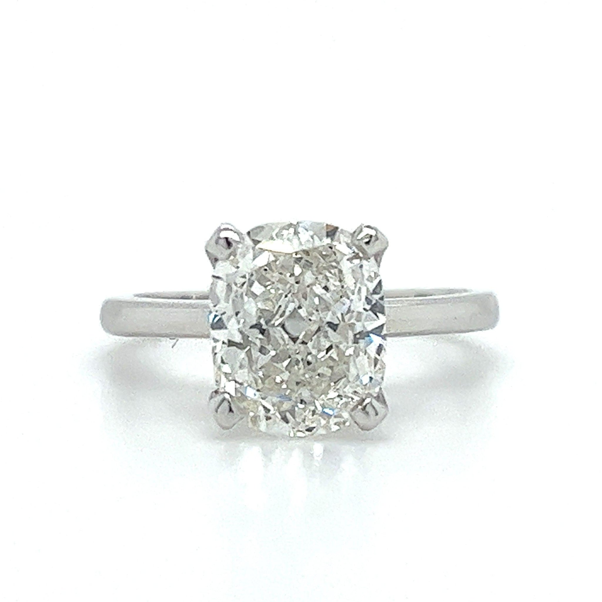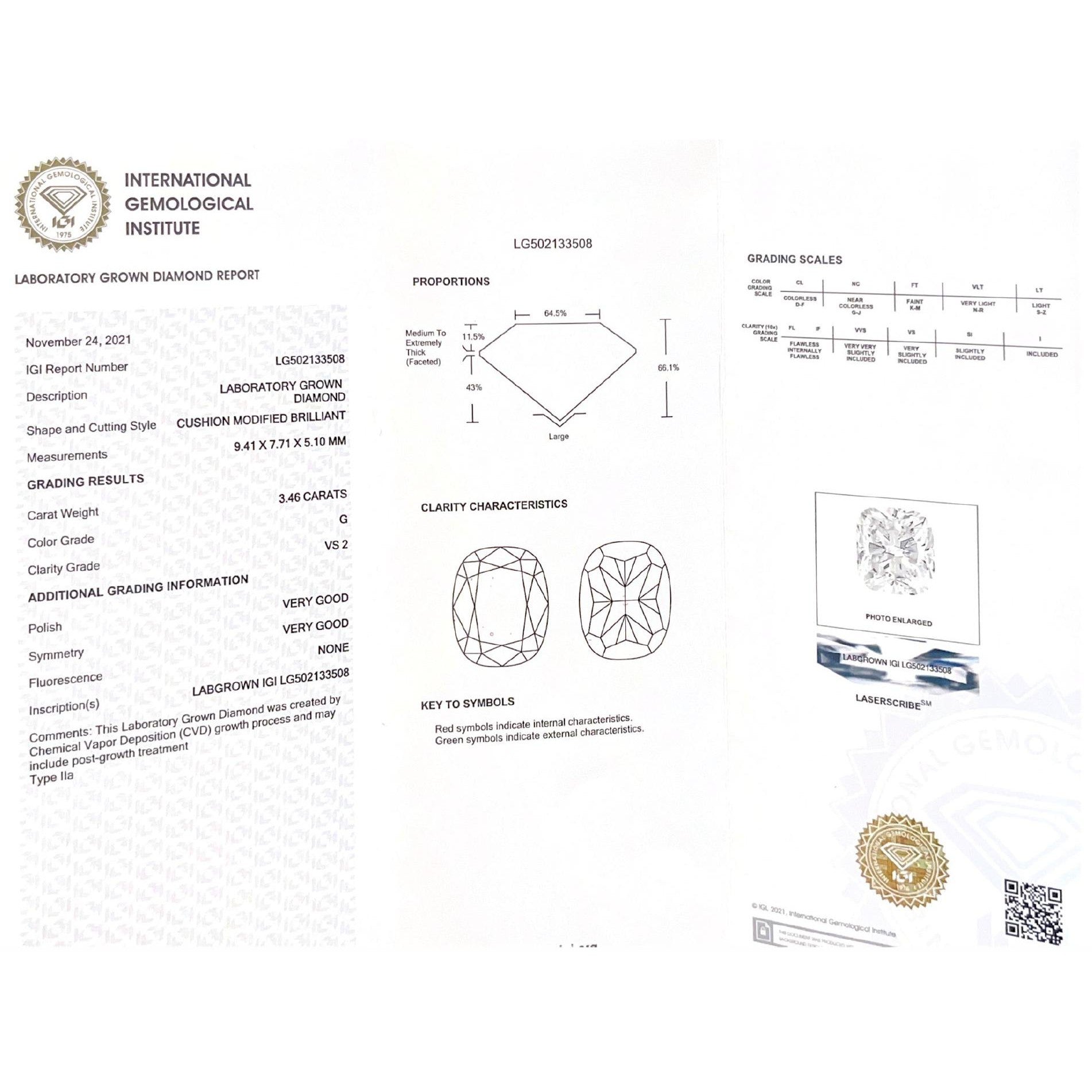 3.46 Carat White Gold Cushion Cut Lab Diamond Engagement Ring. Cushion cut, G color, VS2 clarity. Lab-grown diamond engagement ring mounted in 18k white gold solitaire setting. This Cushion cut has a unique elongated cut, making it appear slightly like an oval cut. Cut like a cushion, shaped more like an oval.