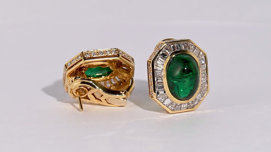 أقراط زامبية من الزمرد والماس بوزن إجمالي 17.3 قيراط معتمدة من GRS ومقطوعة بأسلوب الكابوشون. تتميز بوجود 4.71 قيراط من Diamonds مقطوعة بأسلوب باغيت تشكل هالة حول الحجر المركزي المثبت بإطار. الزمرد، بوزن 6.63 قيراط و5.96 قيراط، معتمد بلون أخضر زاهٍ.