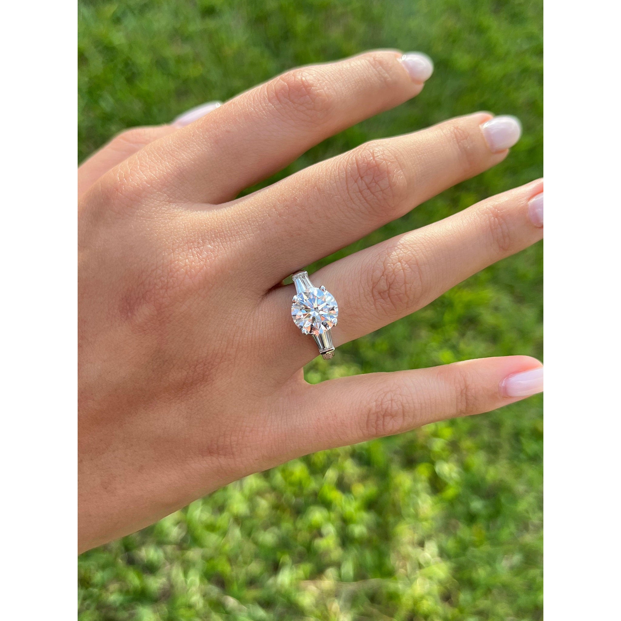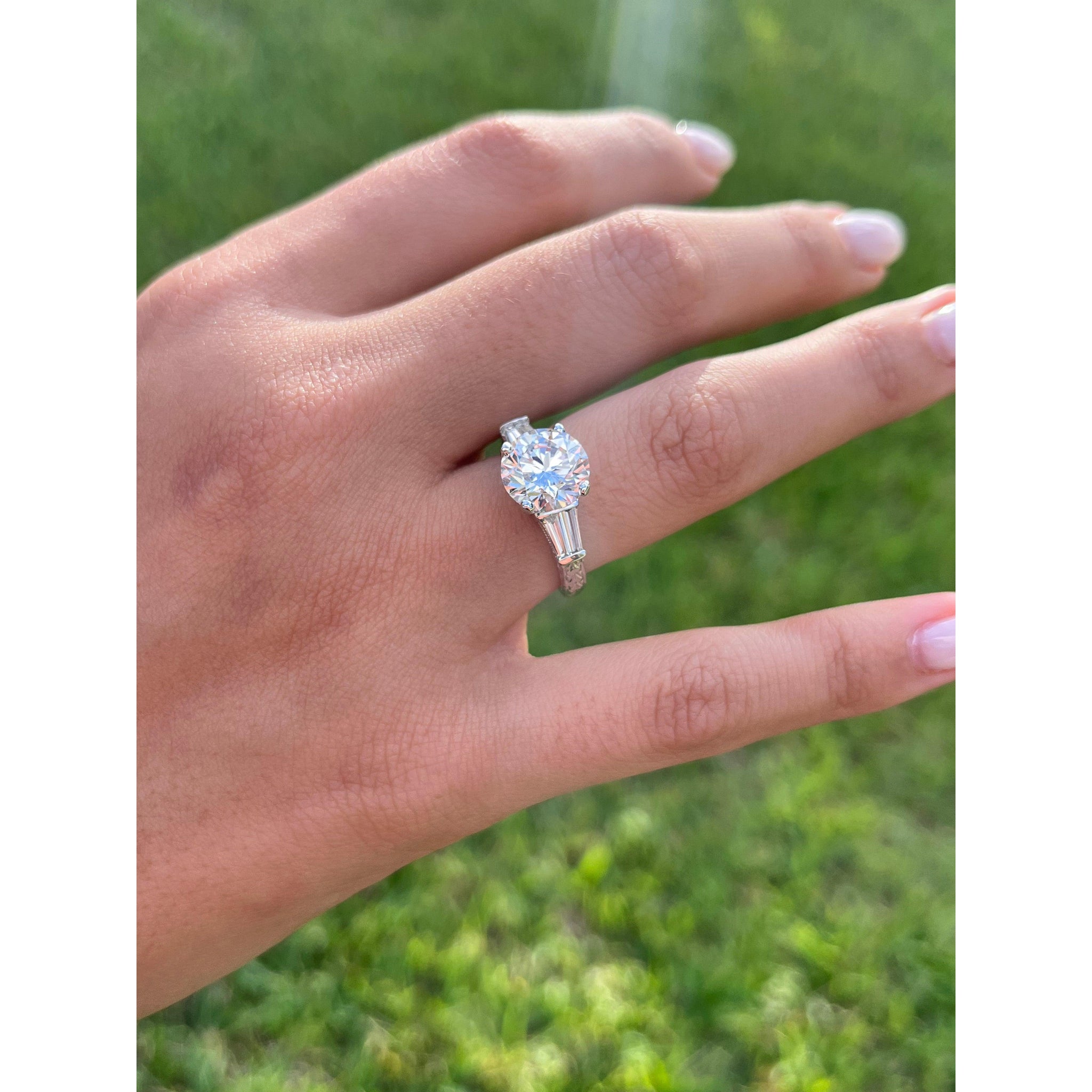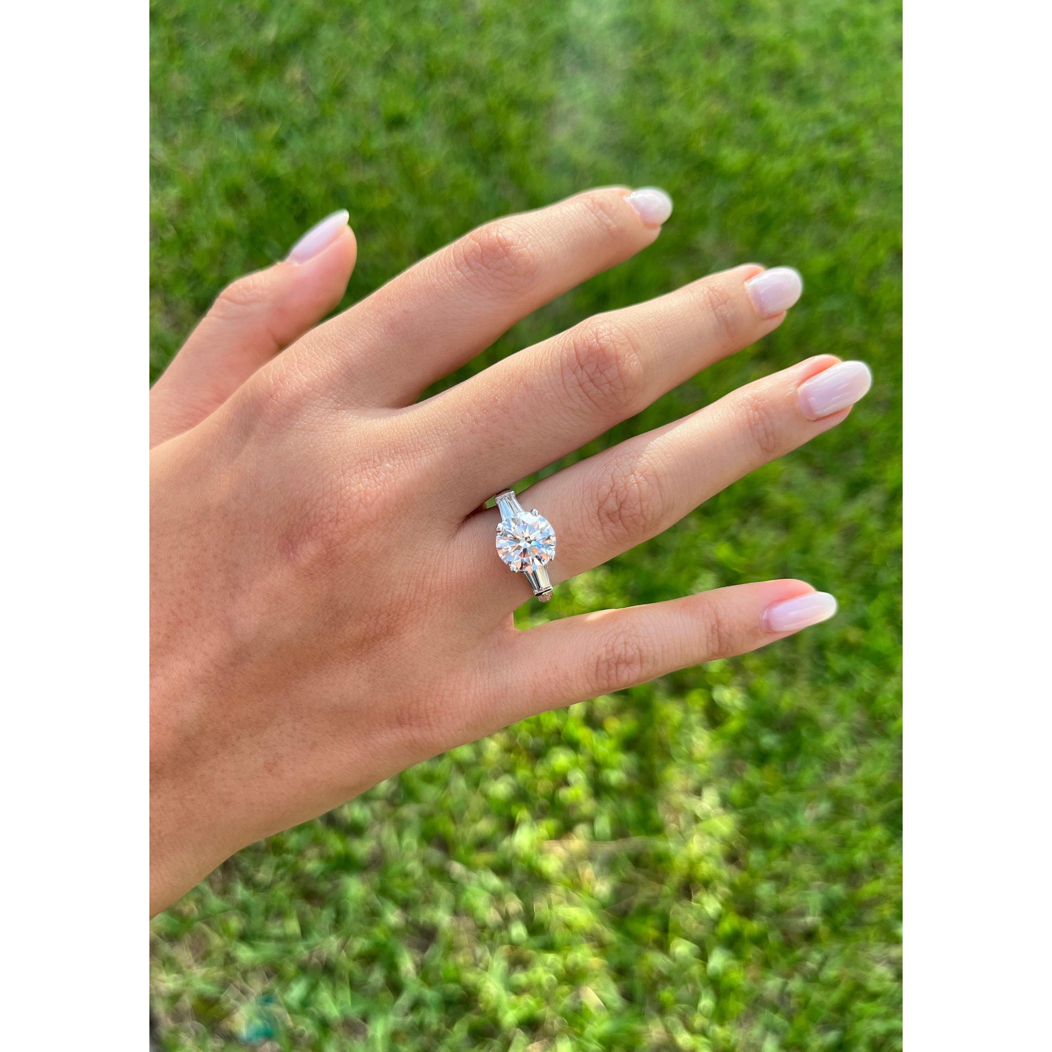 Vibrant and brilliant 3 carat round cut lab-grown diamond set in a baguette-cut, side stone, platinum mounting.