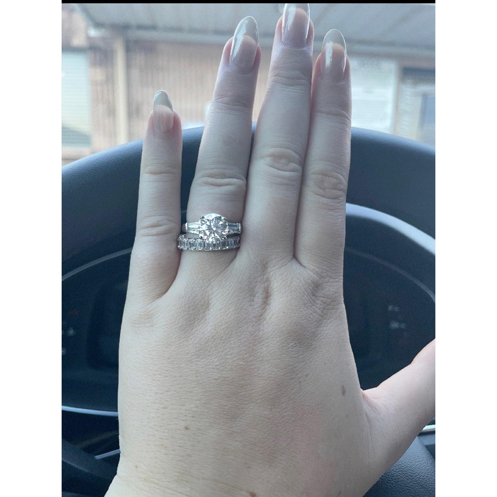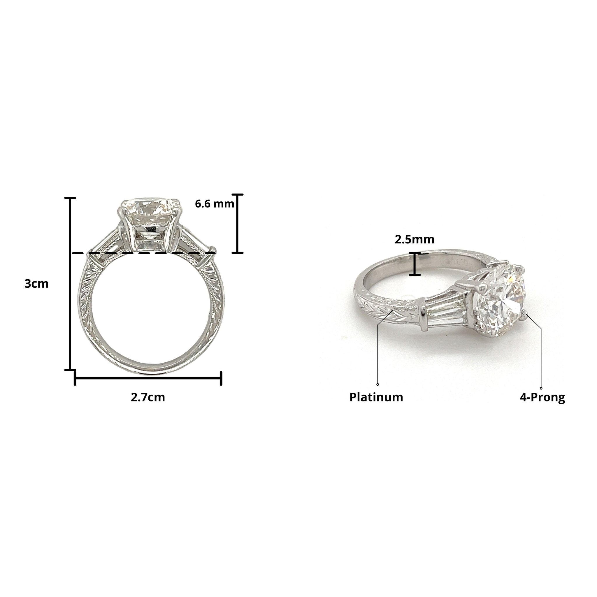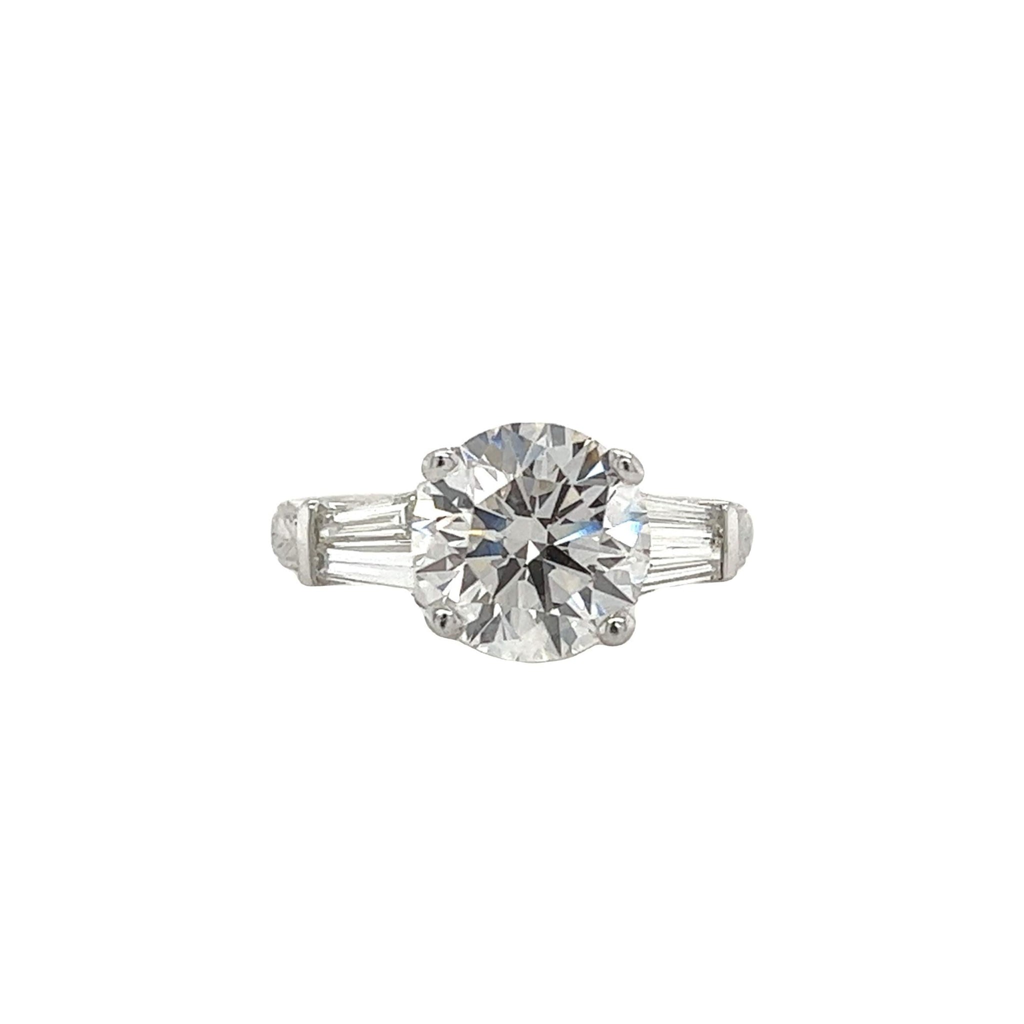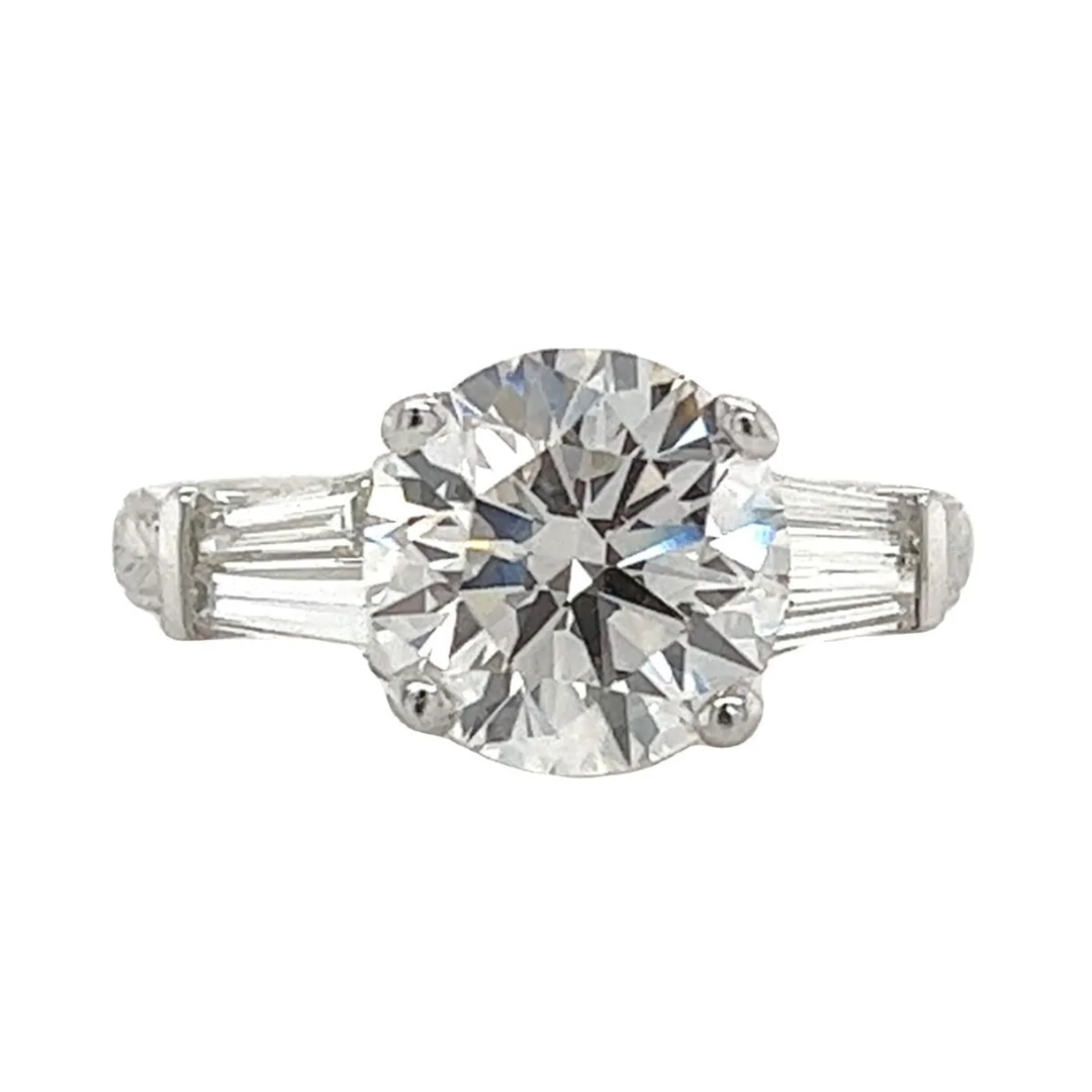 Vibrant and brilliant 3 carat round cut lab-grown diamond set in a baguette-cut, side stone, platinum mounting.