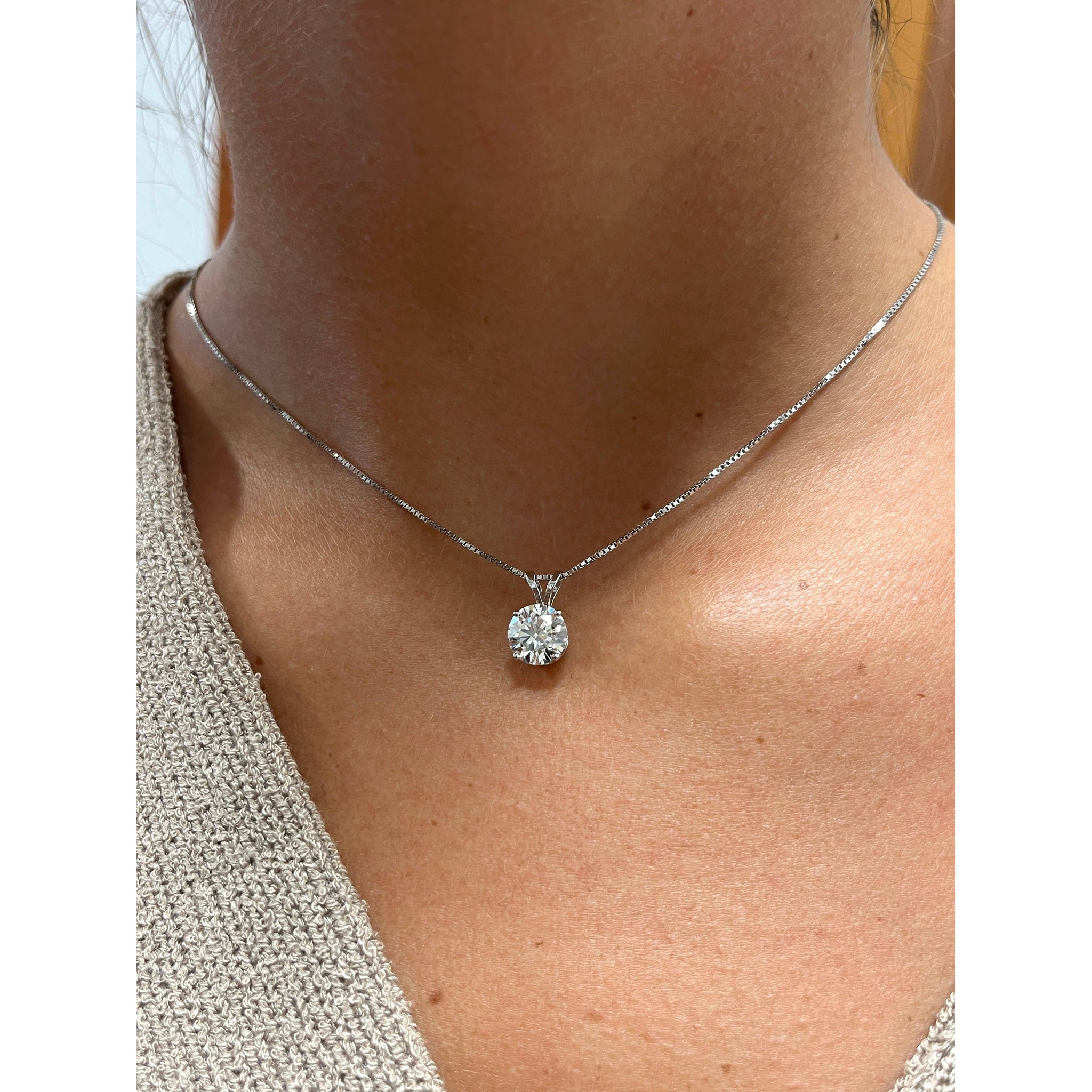3.0 carat round-brilliant cut lab-grown diamond solitaire pendant necklace. Set in 14k solid gold and a secure 4-prong setting.Â
