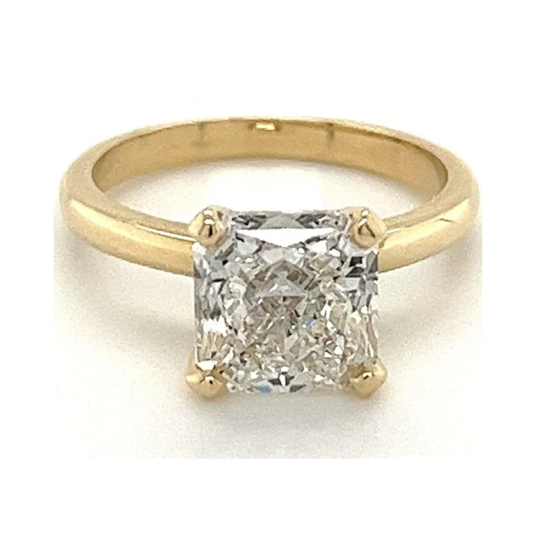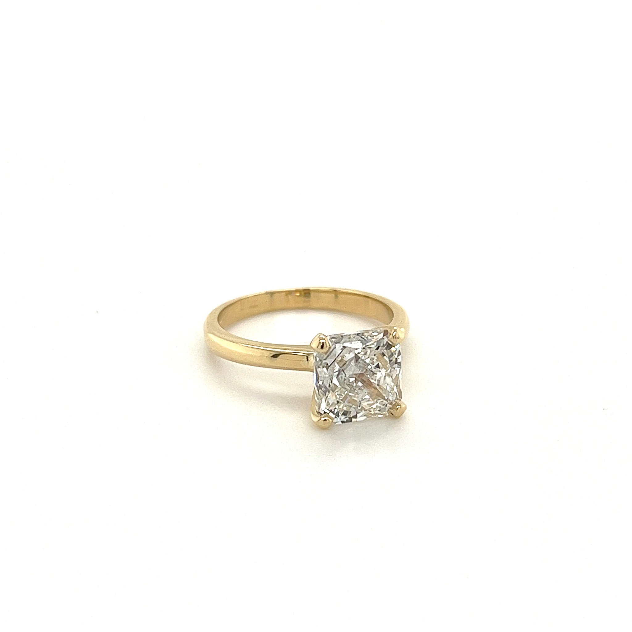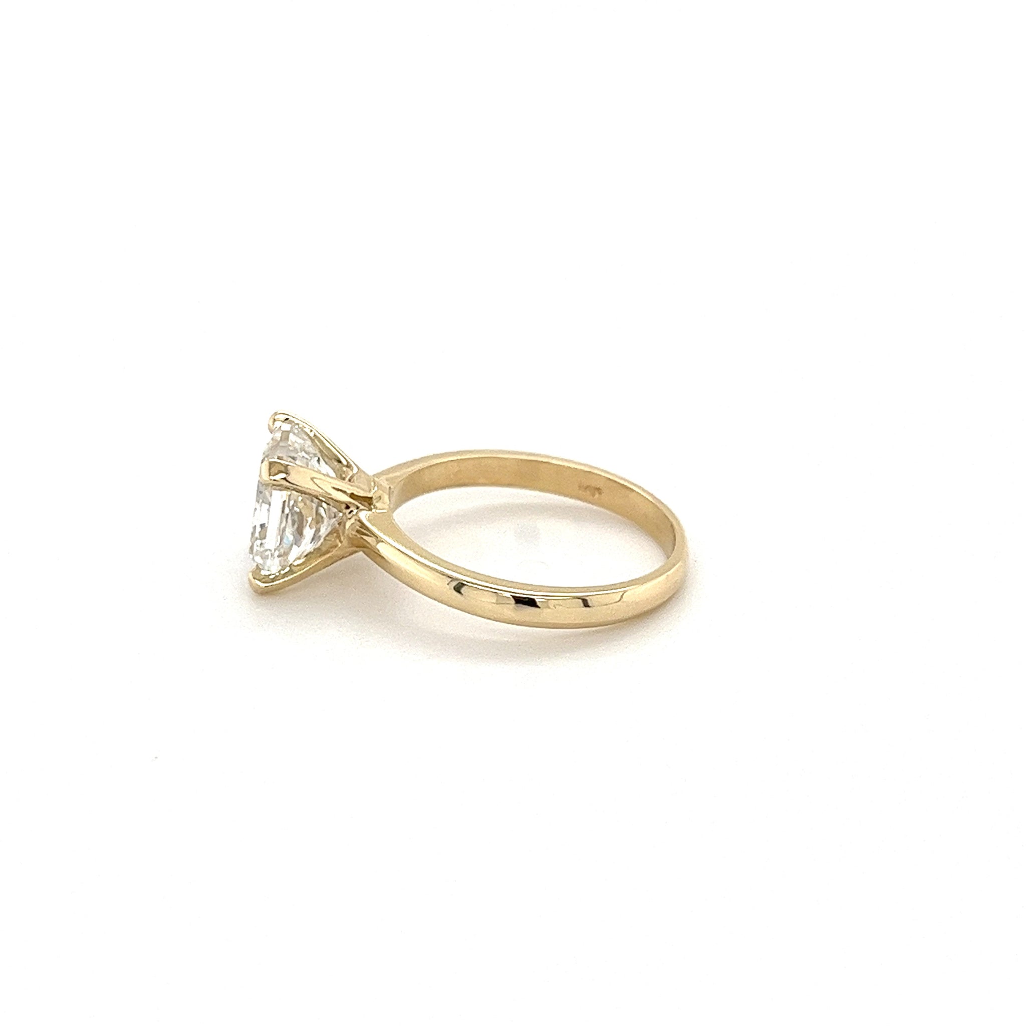 3.12 Carat cushion cut lab-grown diamond set in 14k yellow gold solitaire ring. The center stone bears most of its carat weight in height and width, meaning the size and weight of the stone are very optically present. As opposed to a stone with more depth.