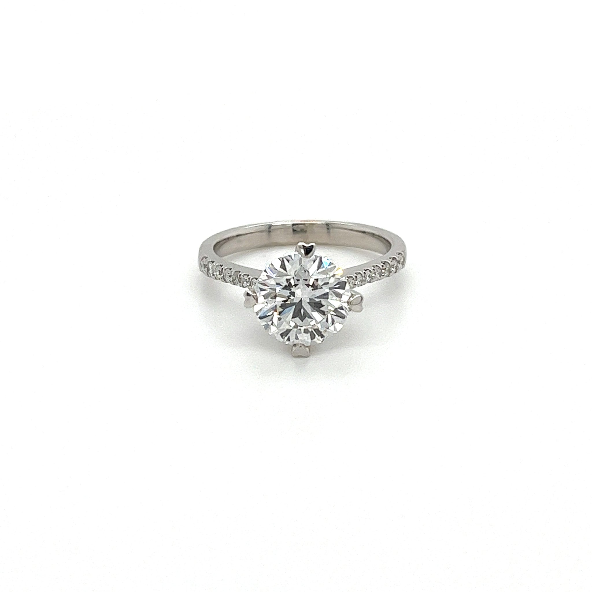 2,60 Karat runder Brillantschliff Labor gezüchteter Diamant CVD Verlobungsring. Mit einem Nord-Süd-Ost-West-Korb mit 4 herzförmigen Krappen. Komplett mit runden Diamant-Seitensteinen, einem Kathedralenschaft und einem scharfkantigen Korb. Es kommt in Größe 7 und verfügt über eine G-Farbe und VVS2-Reinheit, was es zu einem hochwertigen Stück macht, das die Zeit überdauern wird. Alles in 18 Karat Weißgold gefasst.