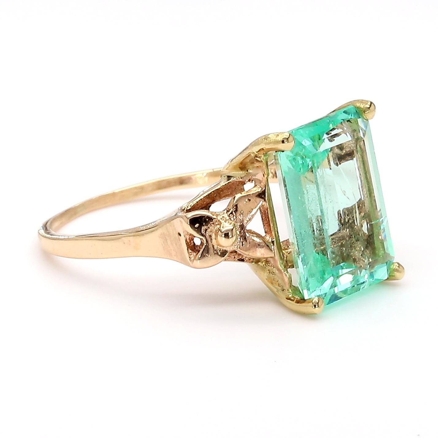 The shank is the defining design feature of this ring — an open scroll and heart-shaped cutout gallery on each shoulder creates a romantic, decorative silhouette that is distinctly vintage in character, referencing mid-century sentimental jewelry design with visible artisan goldsmithing detail. The 4-prong basket is clean and minimal, holding the large emerald cut stone securely with four round ball prongs at each corner while leaving the sides fully open for maximum light entry through the step-cut facets. At 2.98 grams in 14K yellow gold with an 11.2 x 8.1mm face, this ring sits prominently on the finger with a commanding emerald presence balanced by the light, open-worked shank beneath.