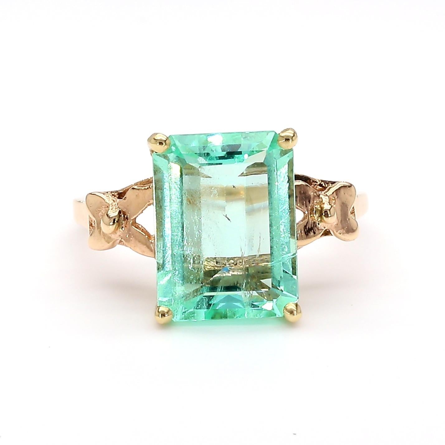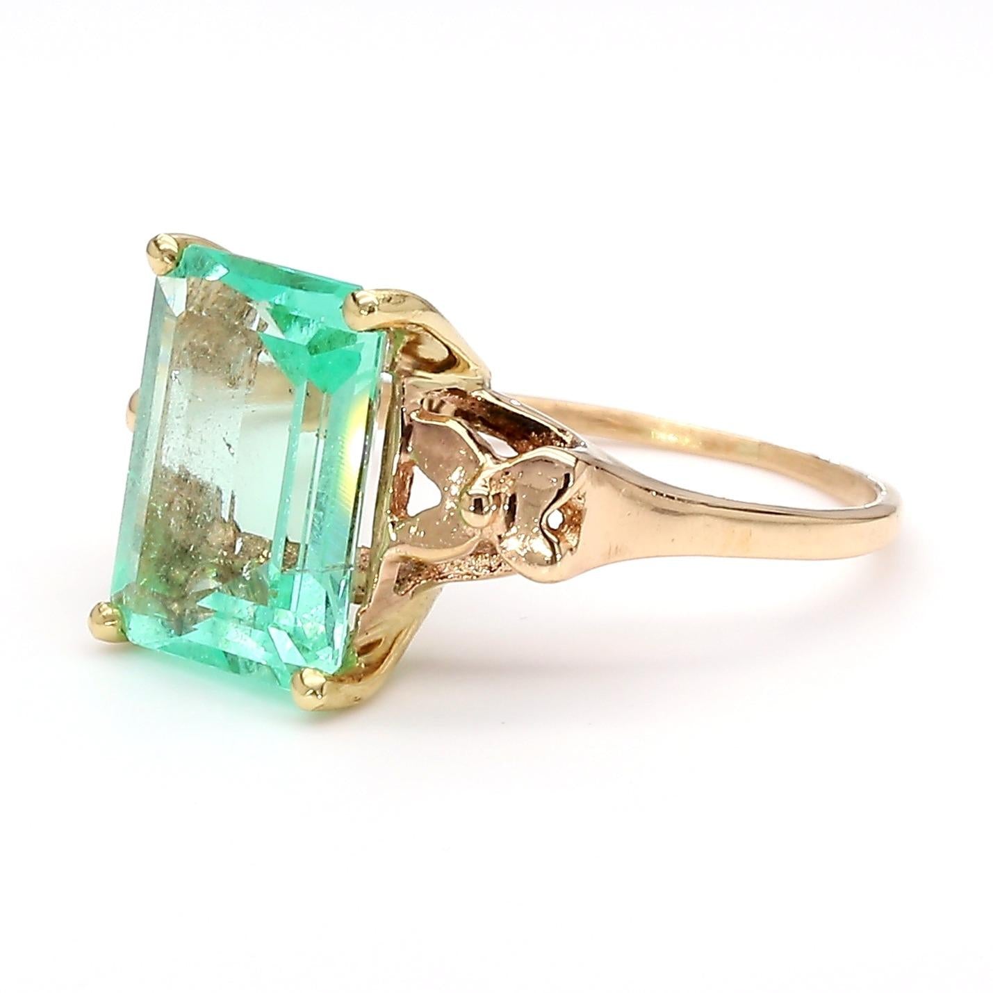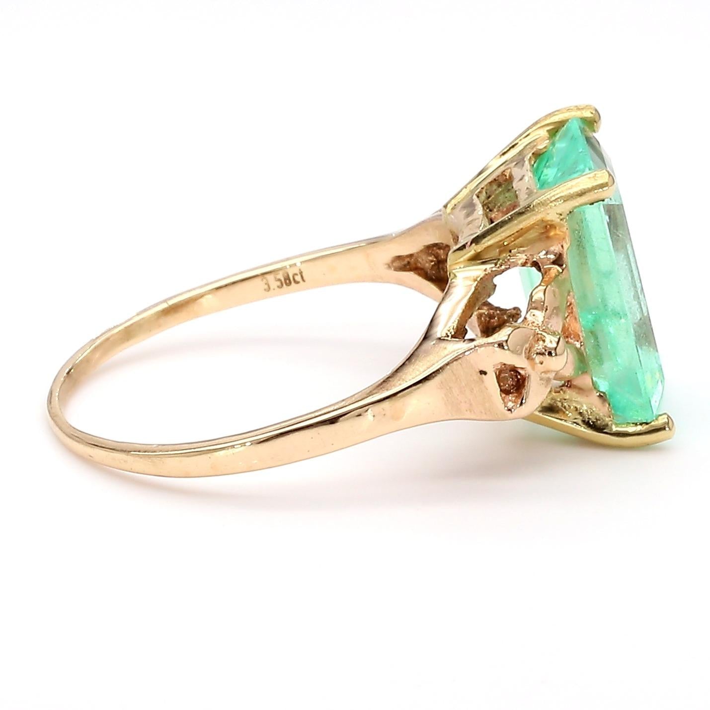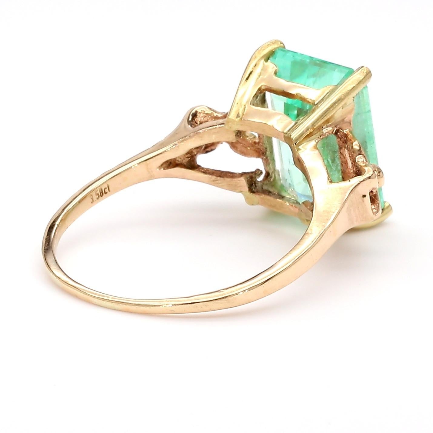 Vintage 14K yellow gold ring featuring a 3.58 carat emerald cut pastel light green Colombian emerald set in a 4-prong solitaire basket above an open scroll and heart cutout shank, stamped 3.58ct on the interior.