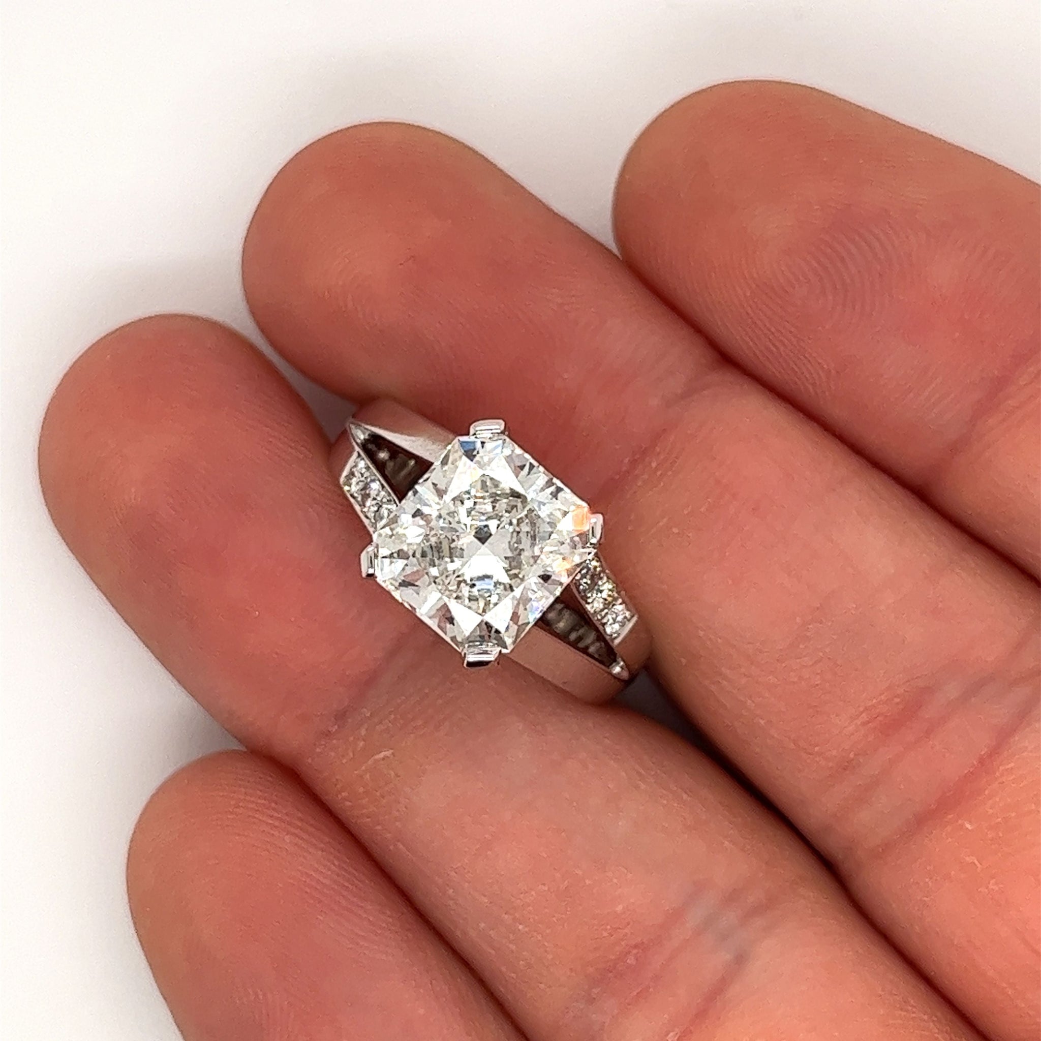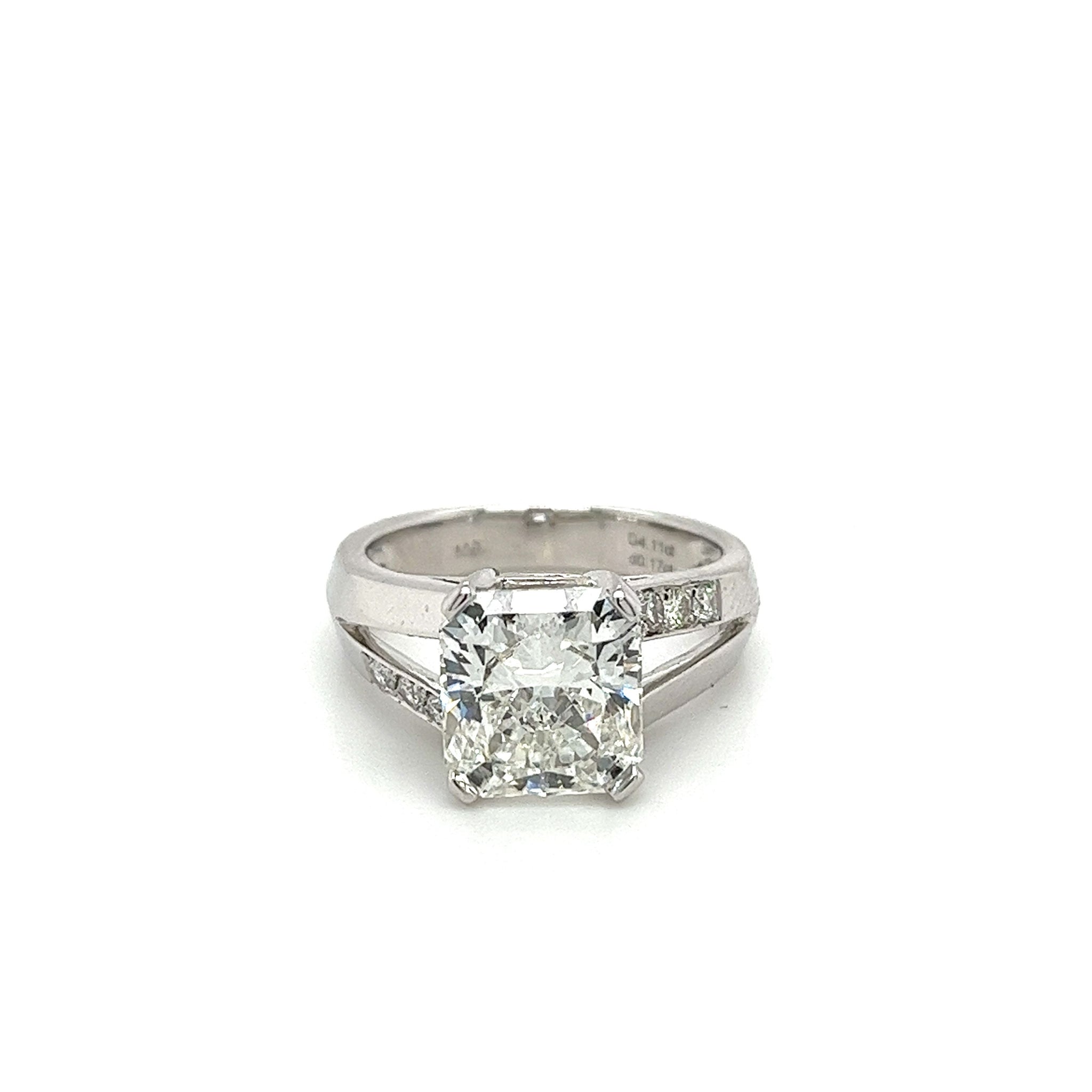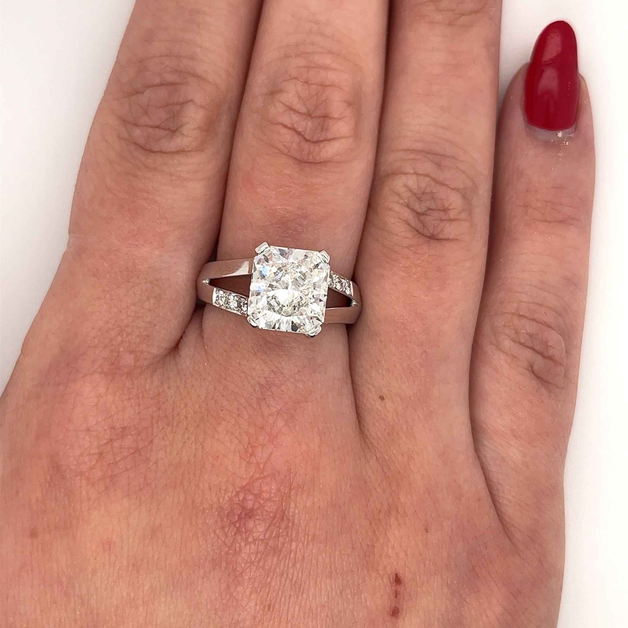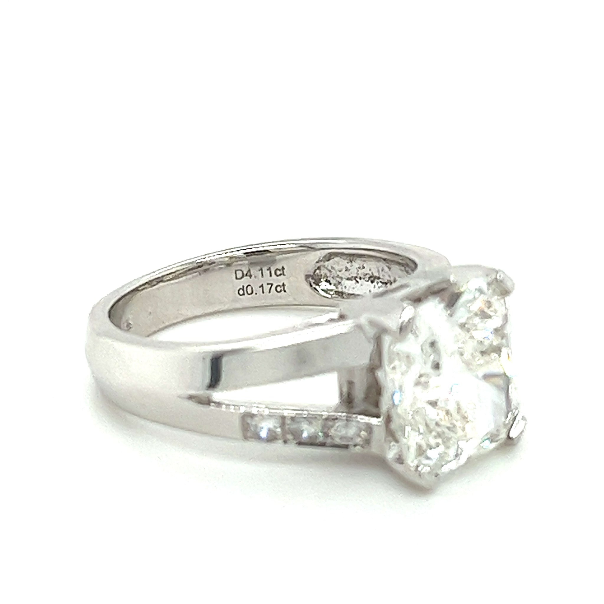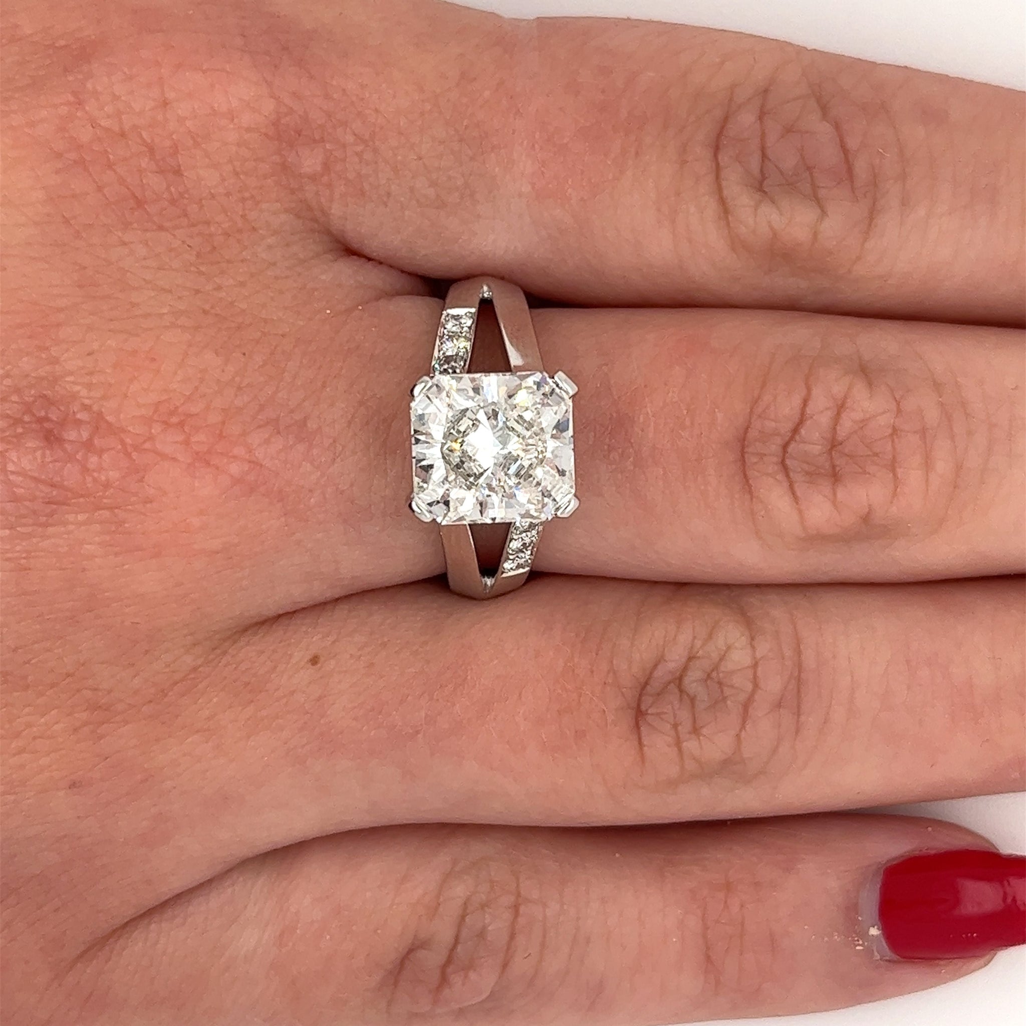 4.11 Carat Radiant Cut Lab Grown Diamond in Split-Shank Diamond Side Stone Ring