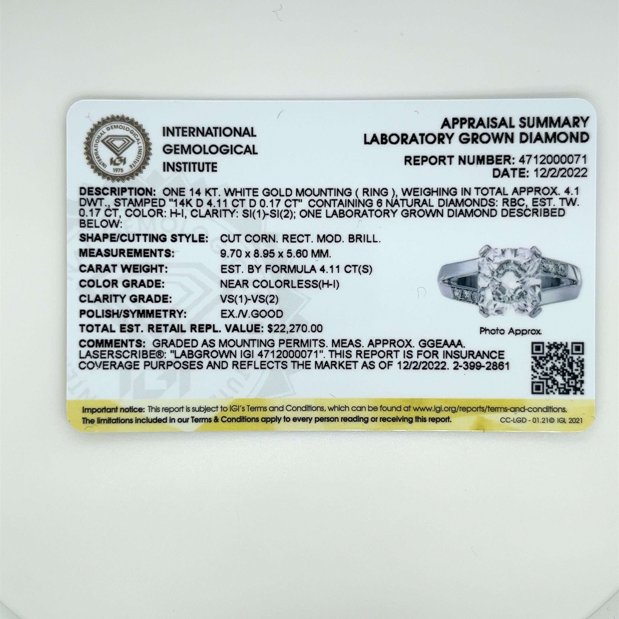 Diamante cultivado en laboratorio de corte radiante de 4.11 quilates certificado por IGI, engastado en un hermoso Anillo de oro blanco de 14 quilates con brazo dividido. La montura del Anillo presenta un impresionante brazo de diamante semi-montado, creando un efecto "espejo" en el perfil.