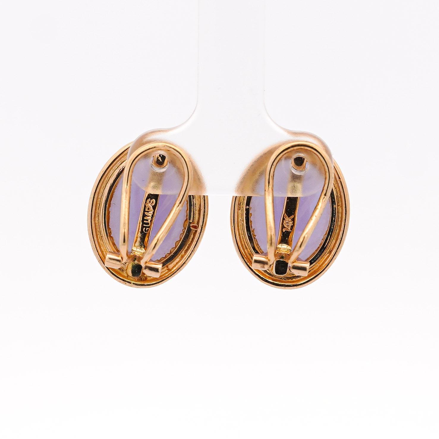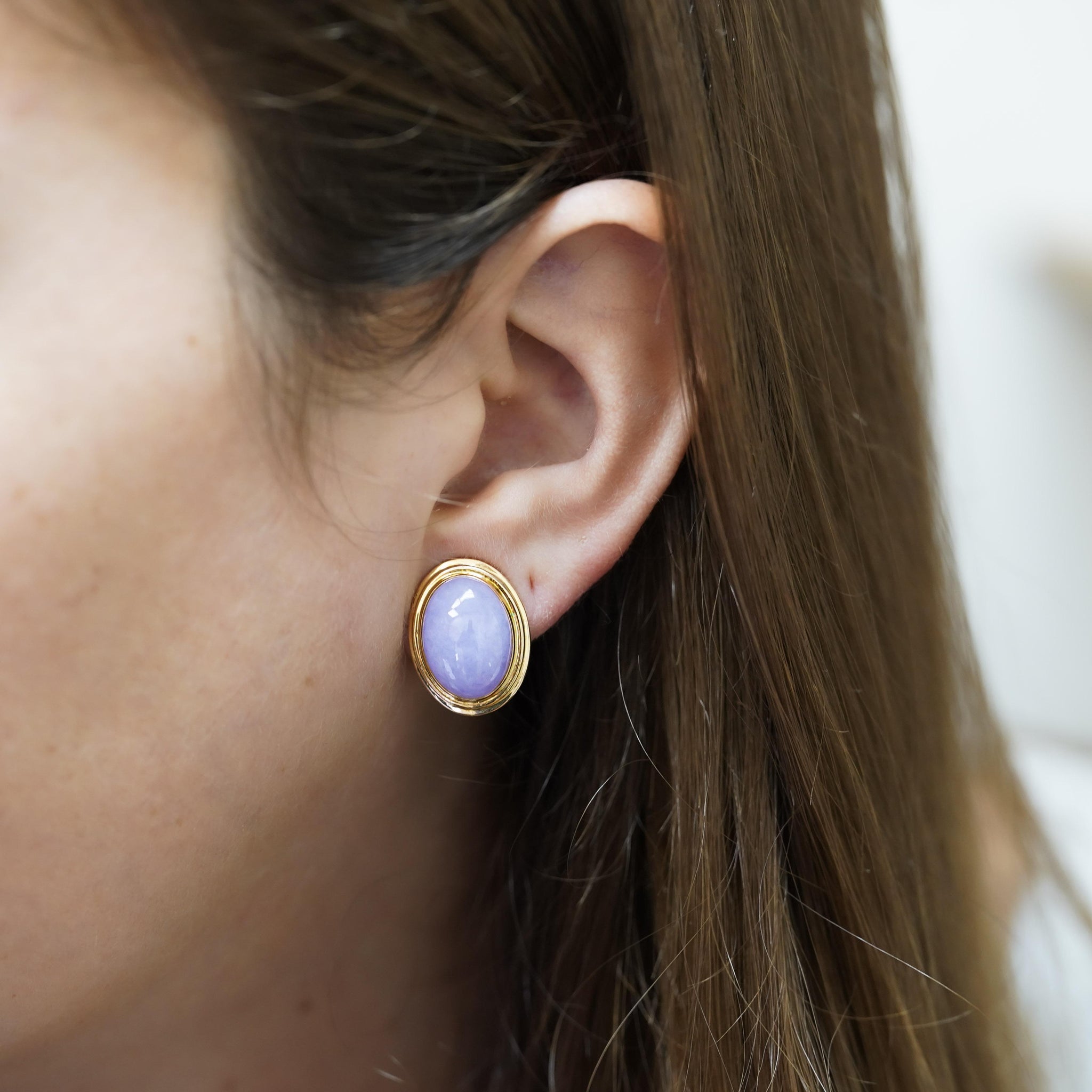 Natural untreated lavender jadeite jade clip-on stud earrings in 14K yellow gold bezel settings with lever back closure mechanism. GUMPS San Francisco signed pieces featuring oval cabochon jade stones measuring 18.6 x 14.6mm.