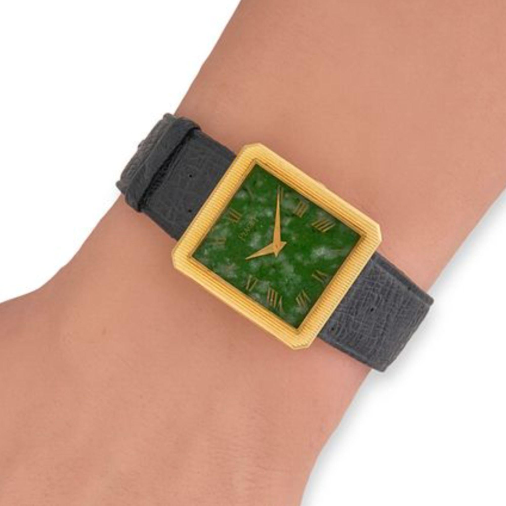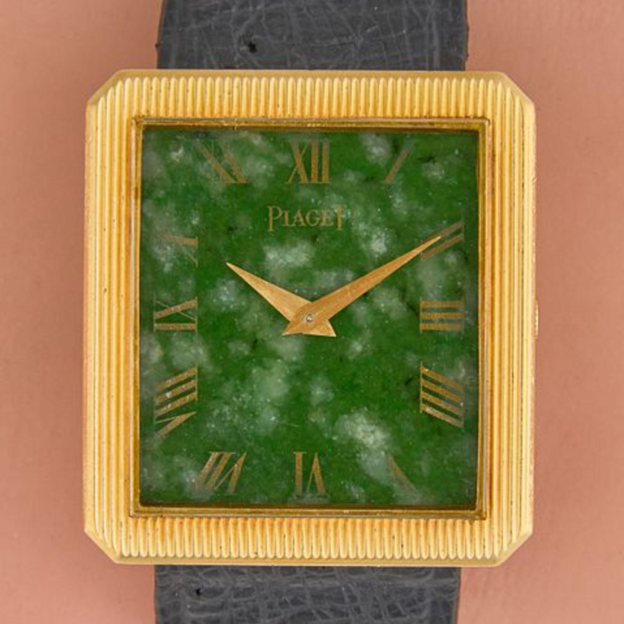 Design & Construction Ribbed yellow gold bezel features vertical fluted pattern creating distinctive textural depth and architectural presence. Natural jade dial displays mottled green surface with applied Roman numeral hour markers in gold tone, creating striking contrast against the organic stone pattern. Square case design with integrated leather strap attachment showcases clean modernist lines characteristic of Piaget's luxury dress watch aesthetic. Gold-tone buckle stamped with Piaget branding completes the refined presentation.