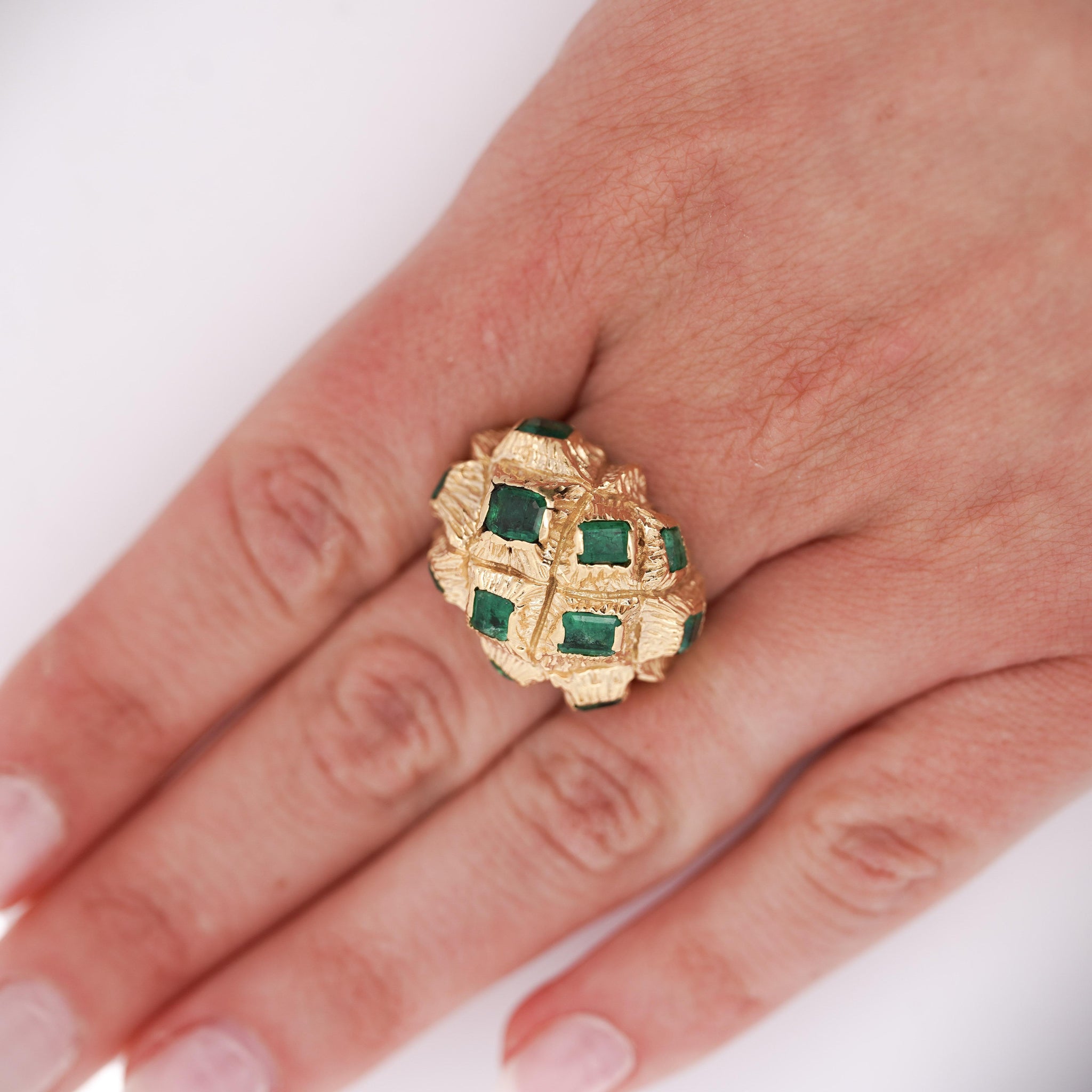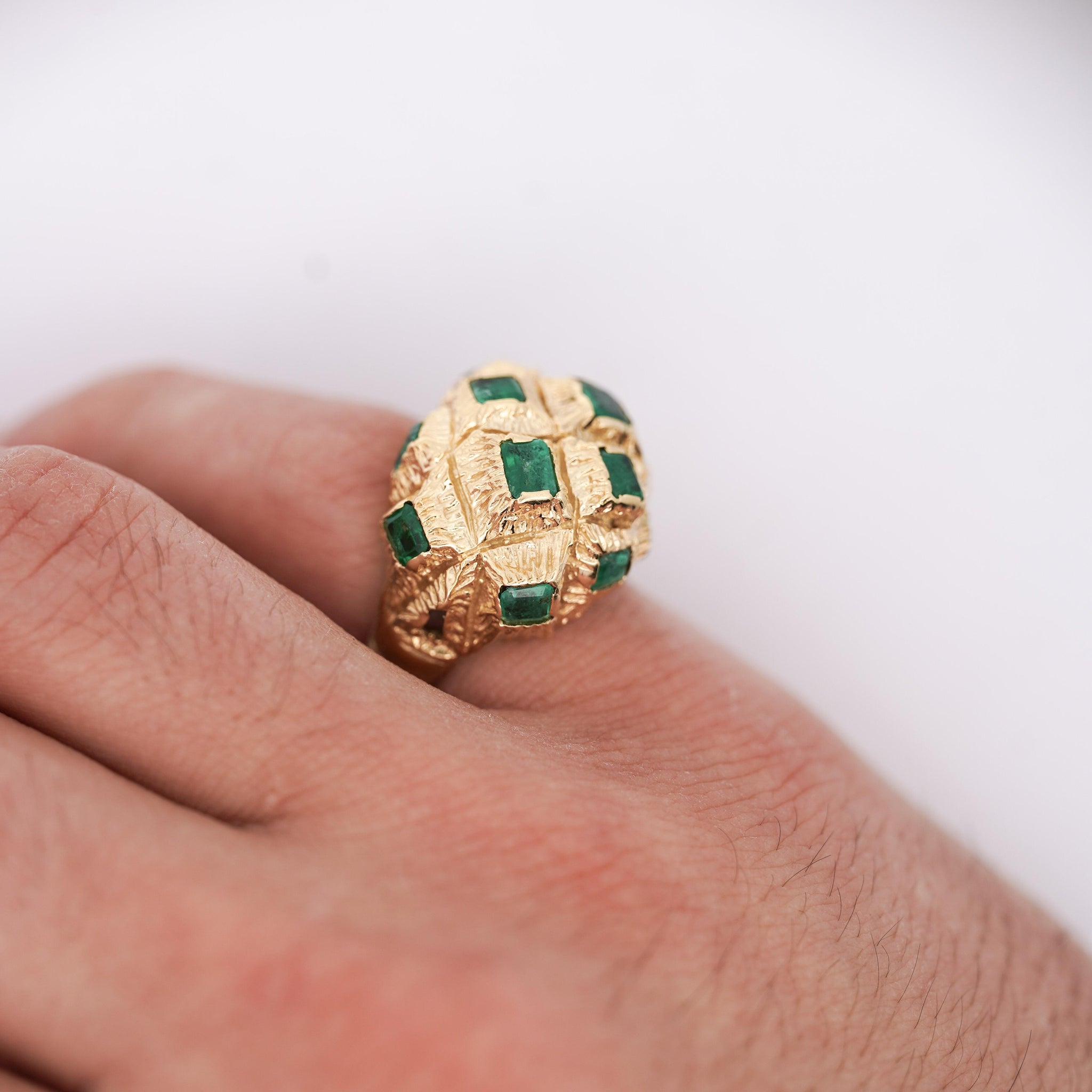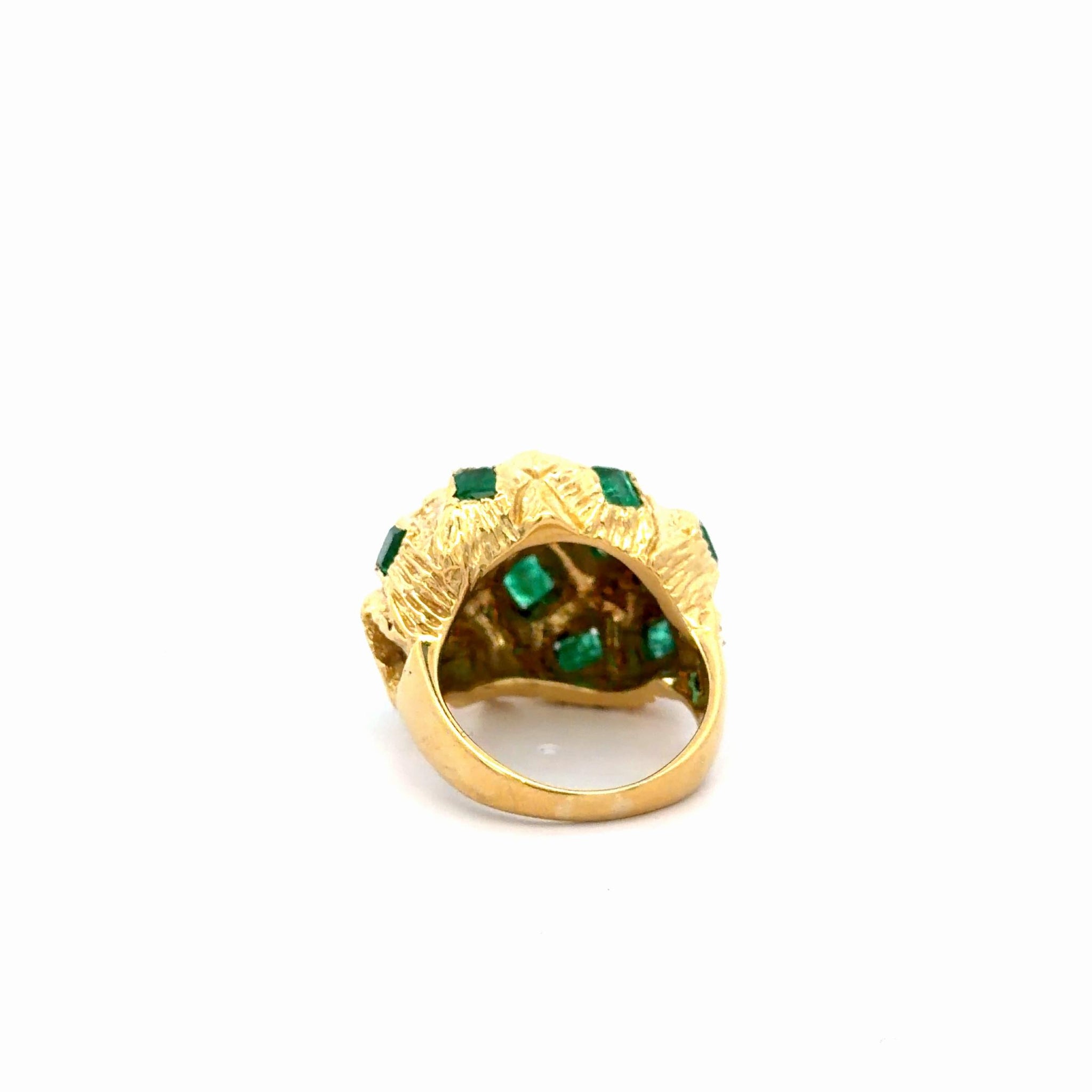 Vintage domed statement ring featuring 3.20 carats of square-cut emeralds set in 18K yellow gold textured basket-weave design. Measuring 24.5 x 19mm with sculptural three-dimensional construction, size 7 adjustable, weighing 18.44 grams, stamped HM.