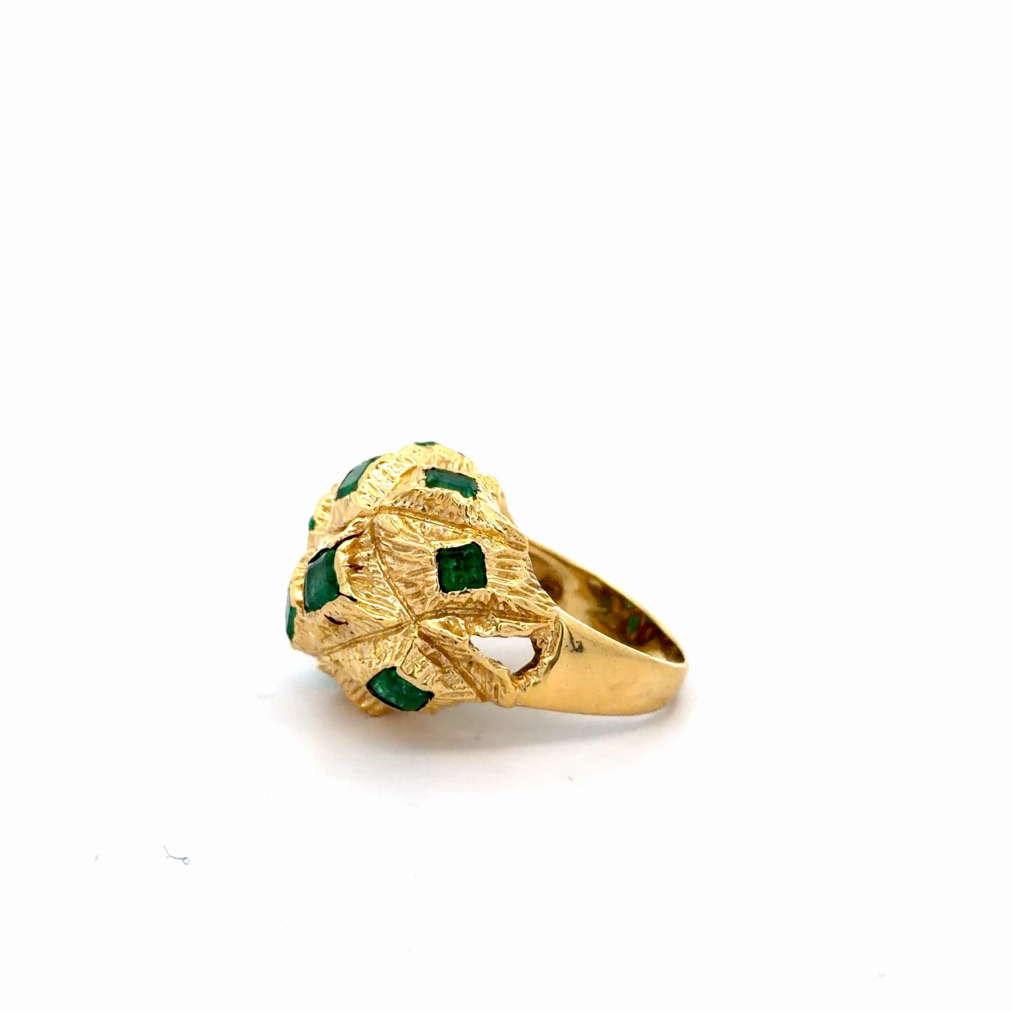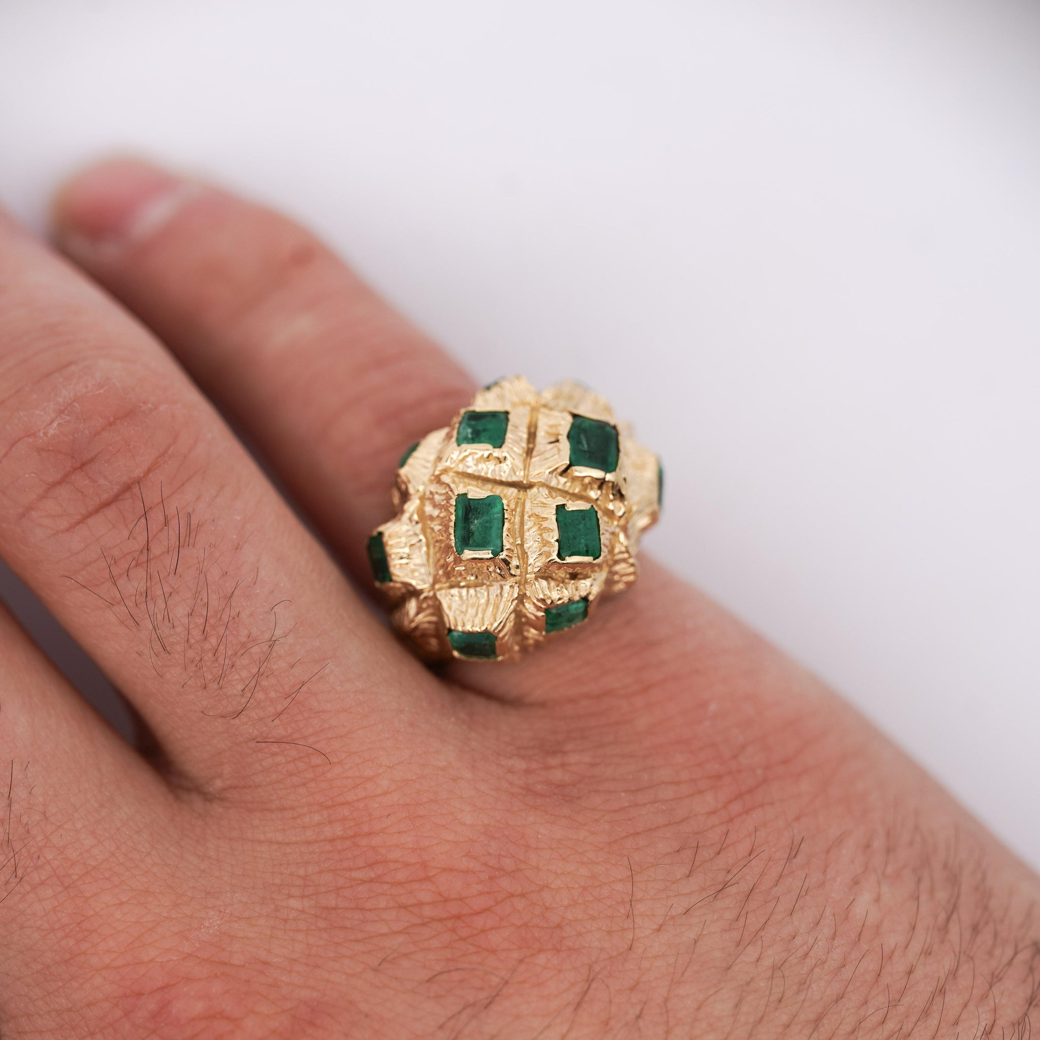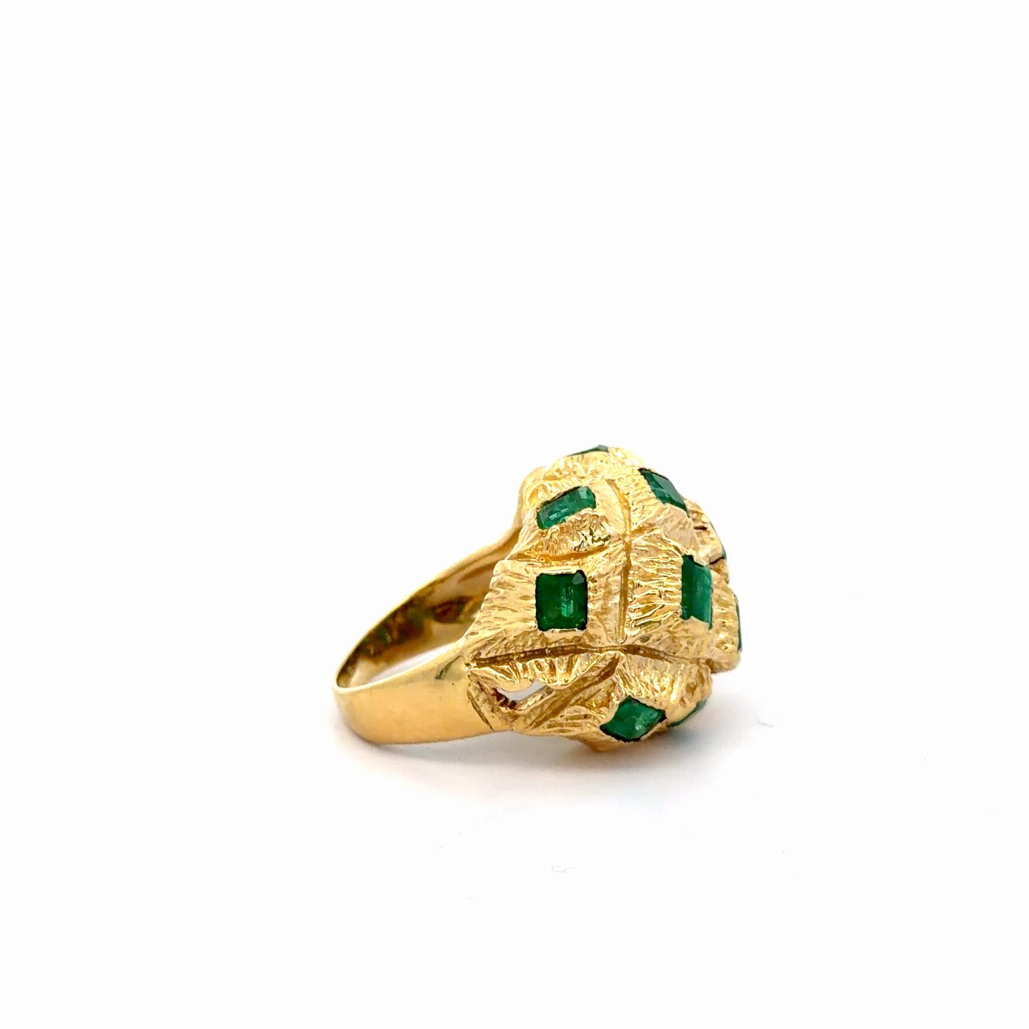 Vintage domed statement ring featuring 3.20 carats of square-cut emeralds set in 18K yellow gold textured basket-weave design. Measuring 24.5 x 19mm with sculptural three-dimensional construction, size 7 adjustable, weighing 18.44 grams, stamped HM.