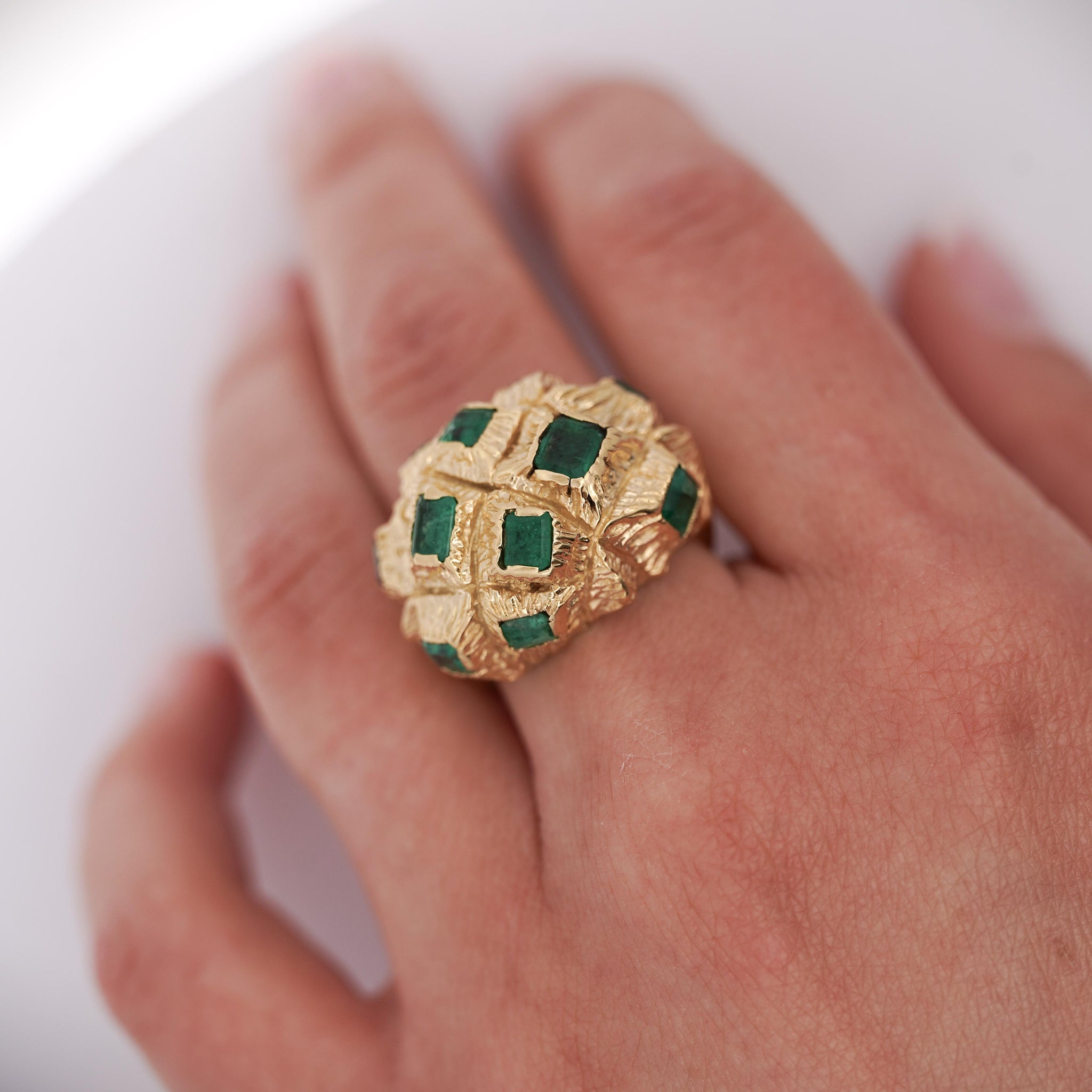 Design & Construction The dome-shaped ring features interwoven textured gold ribbons creating a basket-weave or lattice pattern with three-dimensional volume extending 24.5 x 19mm across the finger. Square-cut emeralds sit in prong settings at the intersection points of the woven gold bands, positioned to peek through the openwork construction. The heavily textured bark or florentine finish on the gold ribbons creates organic surface quality contrasting with the smooth polished emerald facets. The sculptural bombe construction rises dramatically from a smooth polished shank, creating substantial finger presence. The hollow construction reduces weight while maintaining bold visual impact.