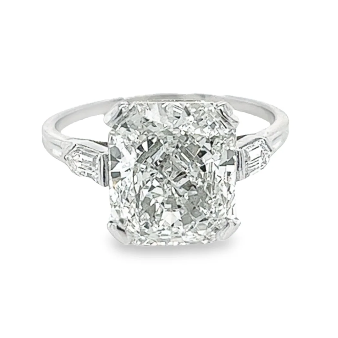 5 carats diamant taille radiant cultivé en laboratoire CVD dans un ensemble de platine Anciens pour une bague de fiançailles avec 2 diamants taille bullet sur les côtés.