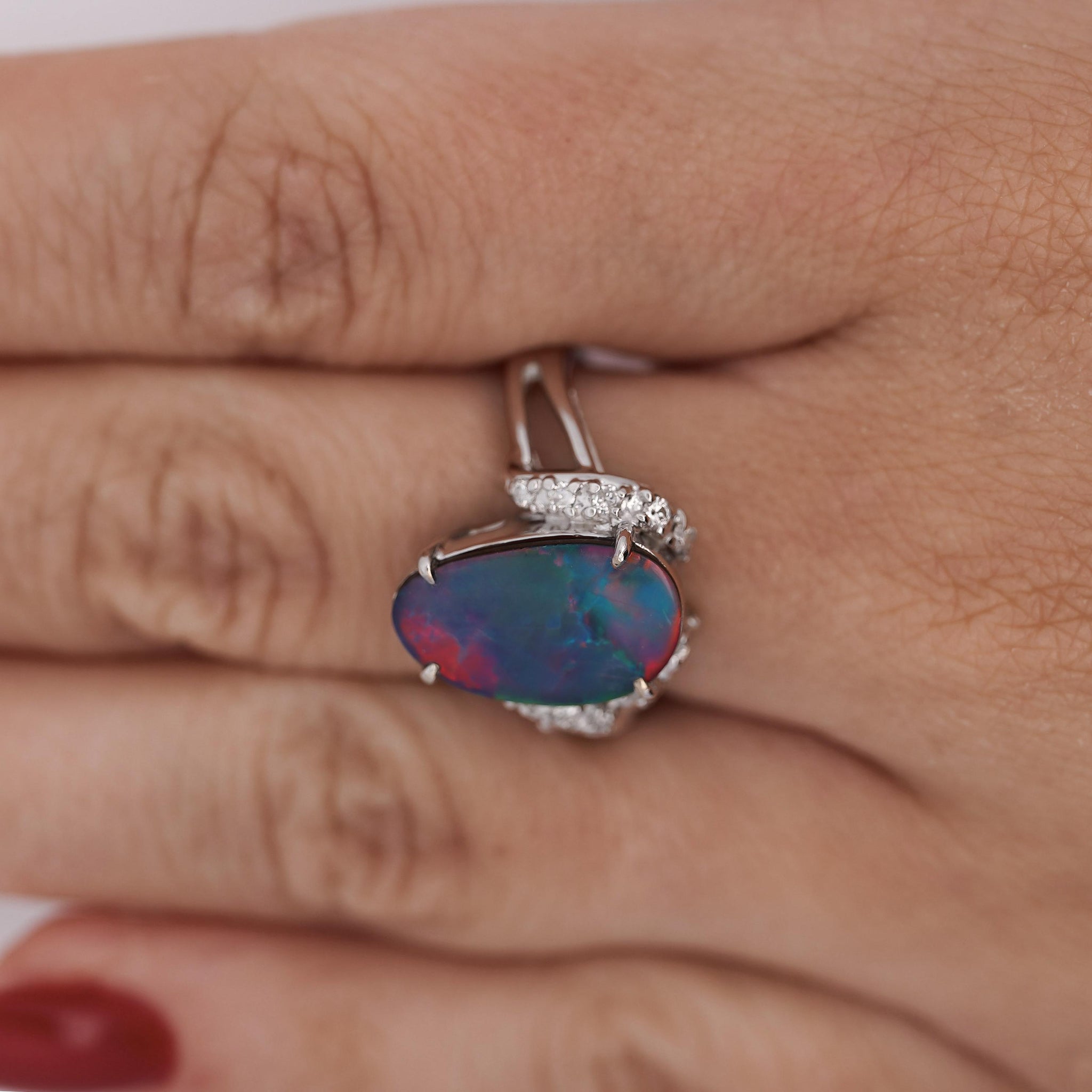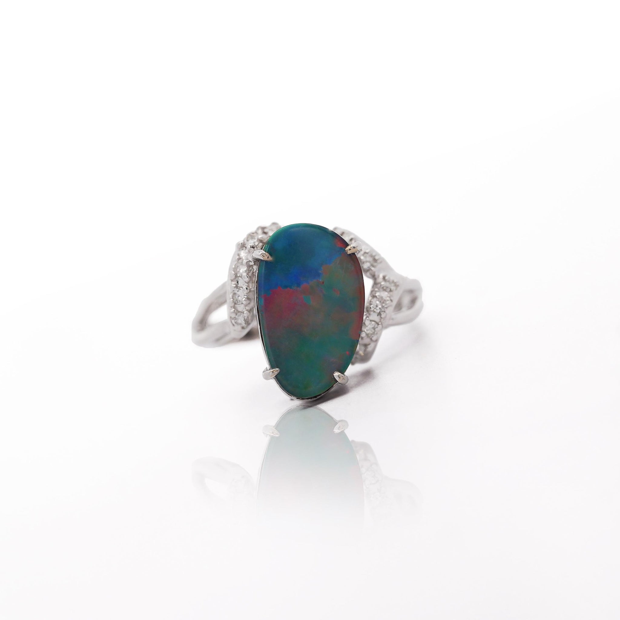Black opal doublet and diamond ring featuring a 15.2 x 9.2mm oval opal doublet with vibrant blue, red, and green color play, accented by 0.20 carats of diamonds in 14K white gold twisted shank design. Ring size 7.5, adjustable.