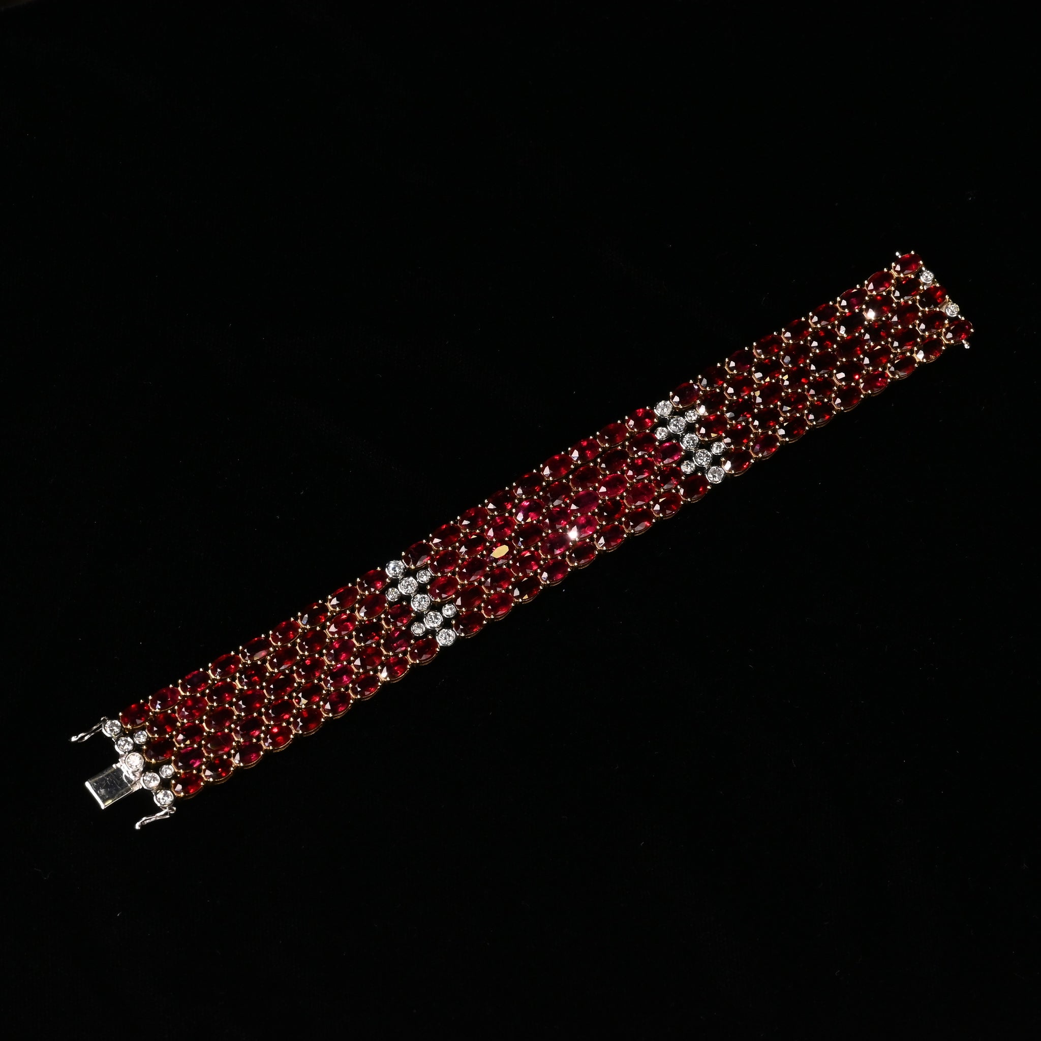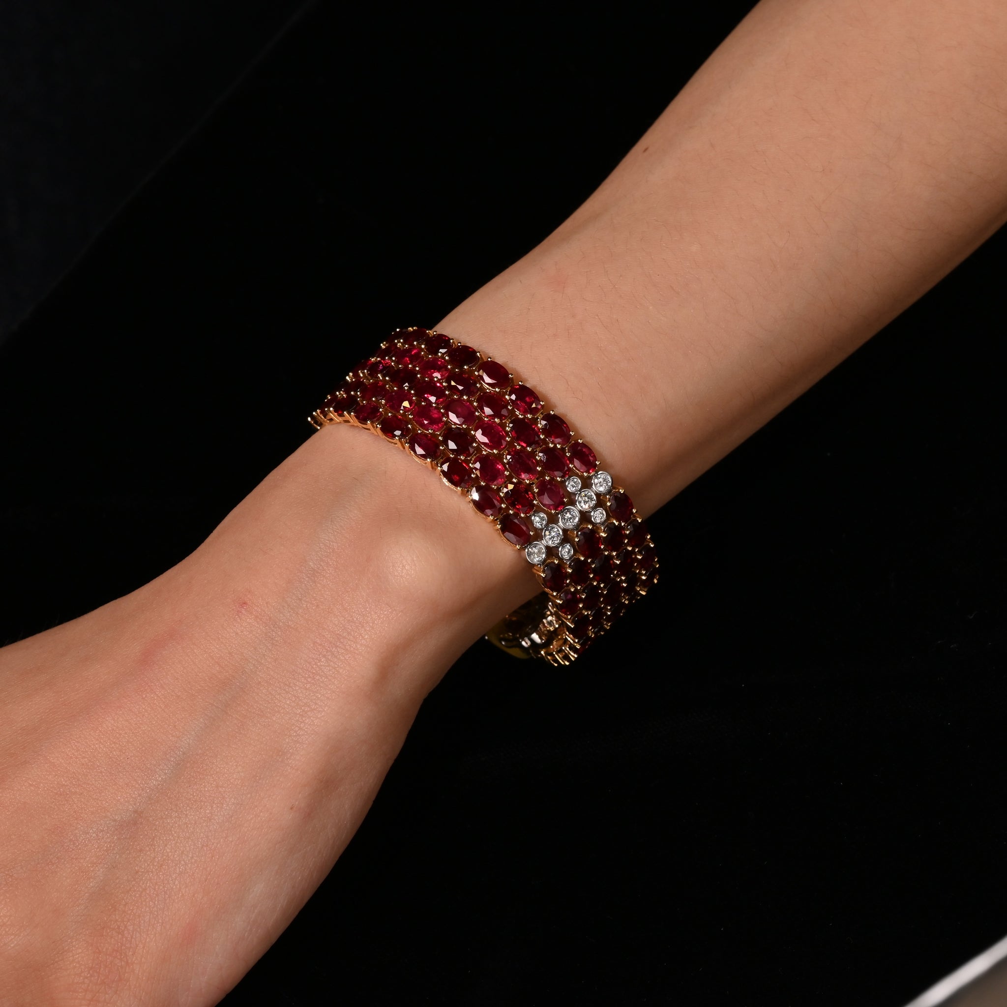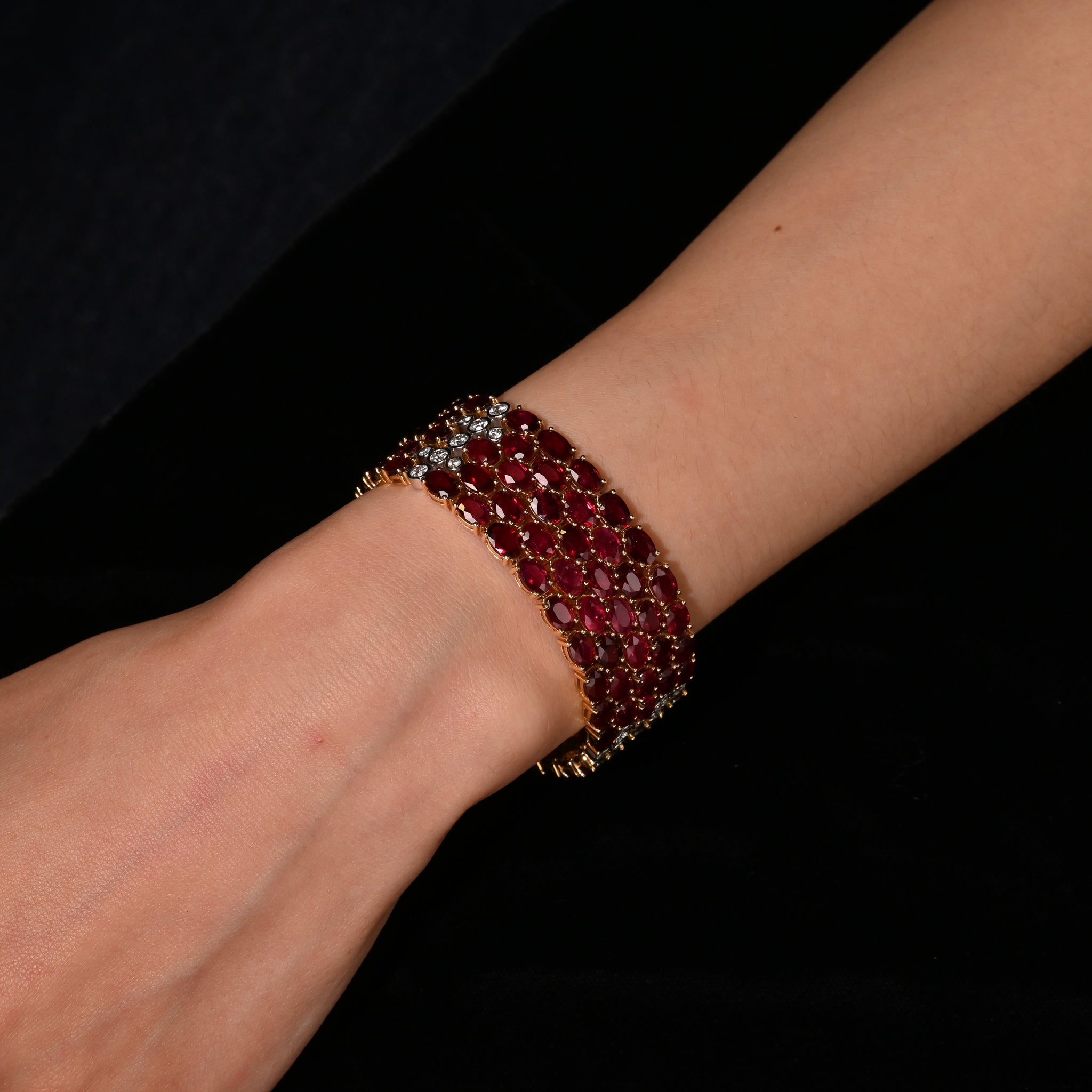 5 rows of oval cut rubies and round cut diamonds. All natural mined gemstones and set in 18k solid gold. A luxury tennis bracelet with excellent coverage on the wrist and secure baskets under each stone ensure this piece can be worn daily.
