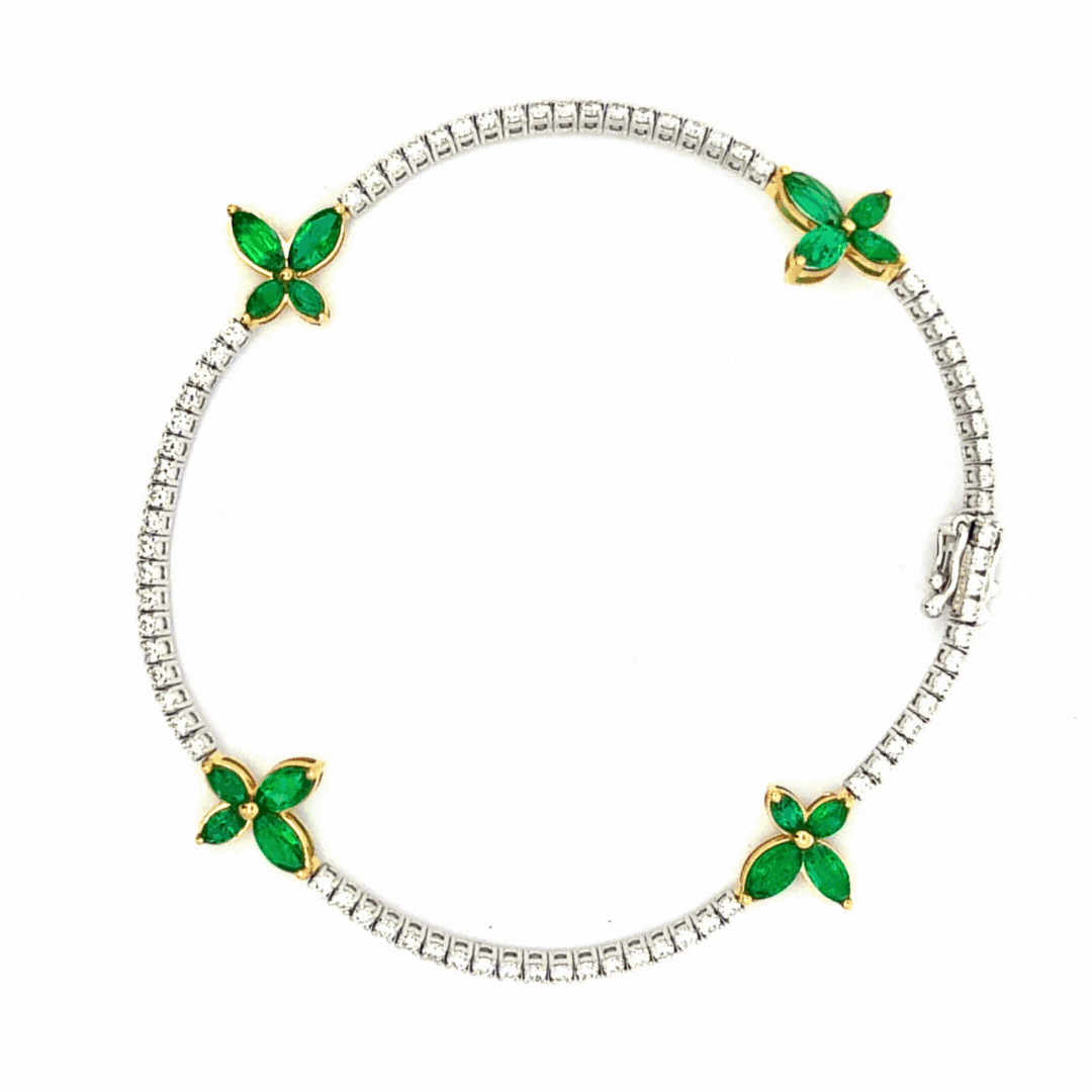 3-4 carat butterfly motif tennis bracelets set with 2-3 carats of natural marquise cut emerald, ruby, or sapphire's and 1.12 carats of lab grown diamonds. Set in 14k white gold with box closure and a double safety latch. 7 inches.