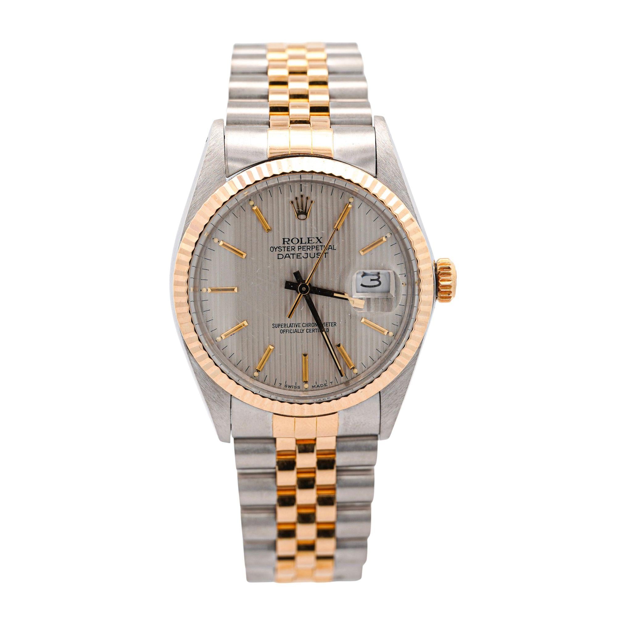 Classic Rolex Datejust automatic watch in two-tone 18K yellow gold and stainless steel featuring a 36mm case with silver tapestry dial and applied gold hour markers. Complete with fluted yellow gold bezel, Jubilee bracelet, date display, and recently serviced and polished November 4, 2025.